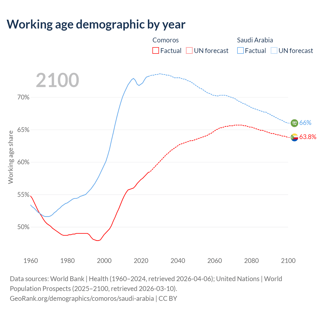The share of older people aged 65 and over is 4.47% in Comoros and 2.95% in Saudi Arabia. Life expectancy in Comoros compared to Saudi Arabia .
