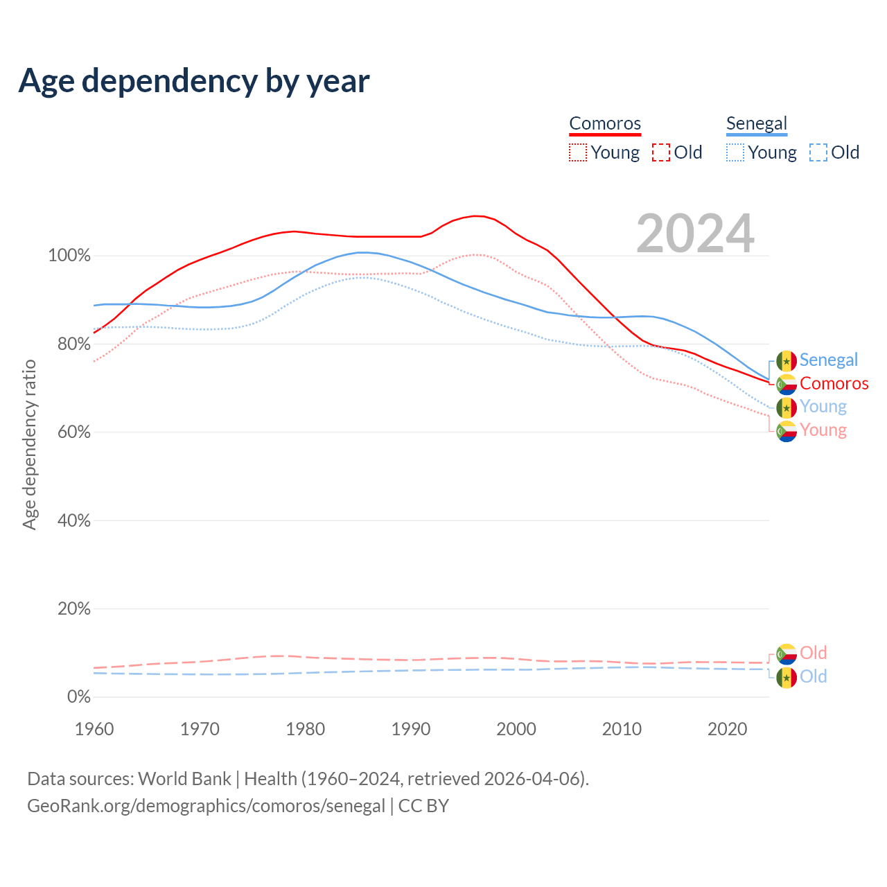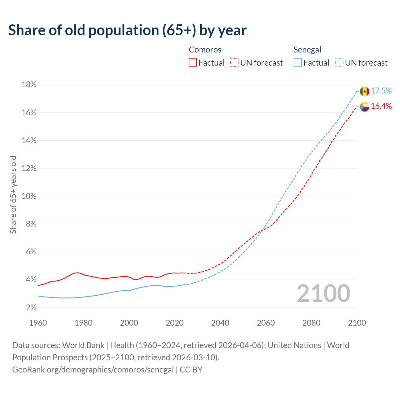 - The share of old-age demographic (65+) in Comoros is 4.47% vs 3.62% in Senegal.