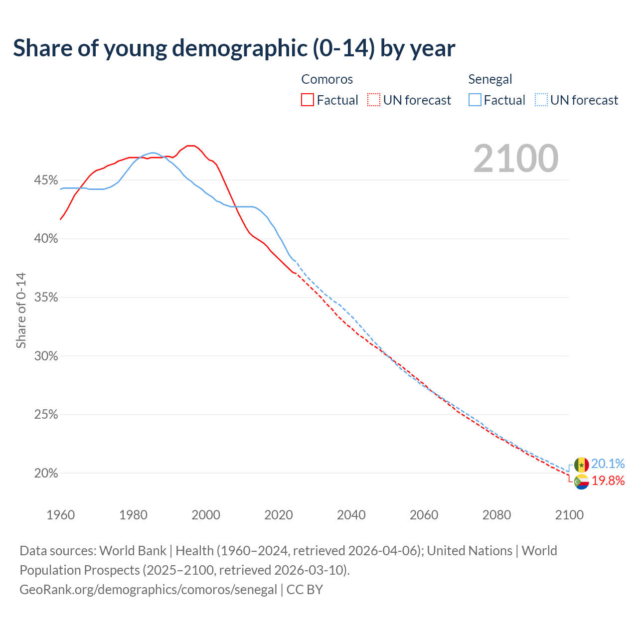 - The share of young demographic (0-15 years old) in Comoros is 37.1% vs 38.2% in Senegal.