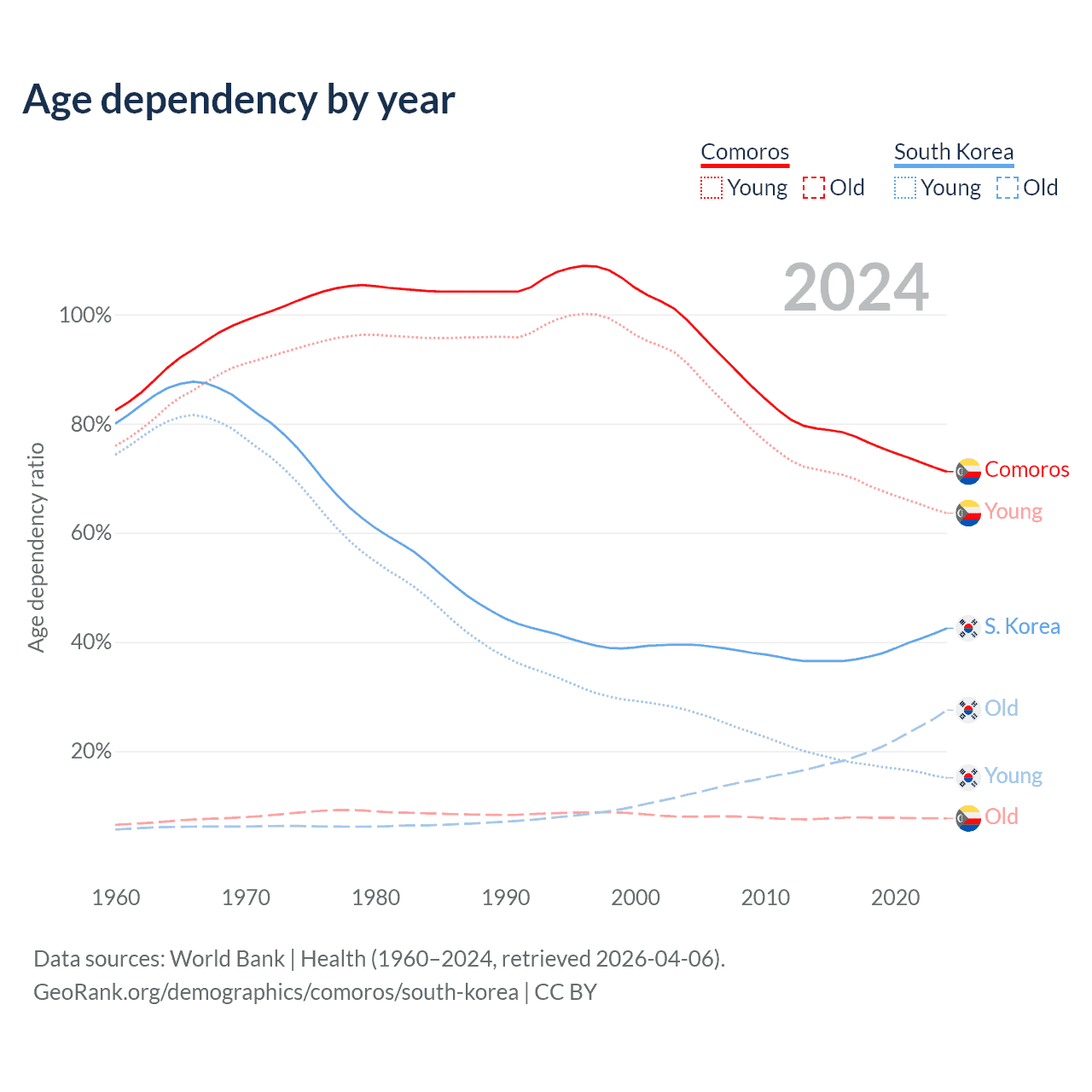 - The share of old-age demographic (65+) in Comoros is 4.47% vs 19.3% in South Korea.