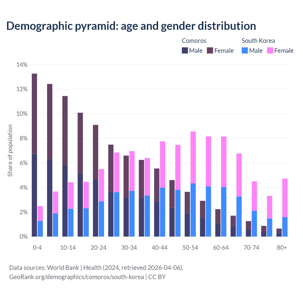The share of older people aged 65 and over is 4.47% in Comoros and 19.3% in South Korea. Life expectancy in Comoros compared to South Korea .