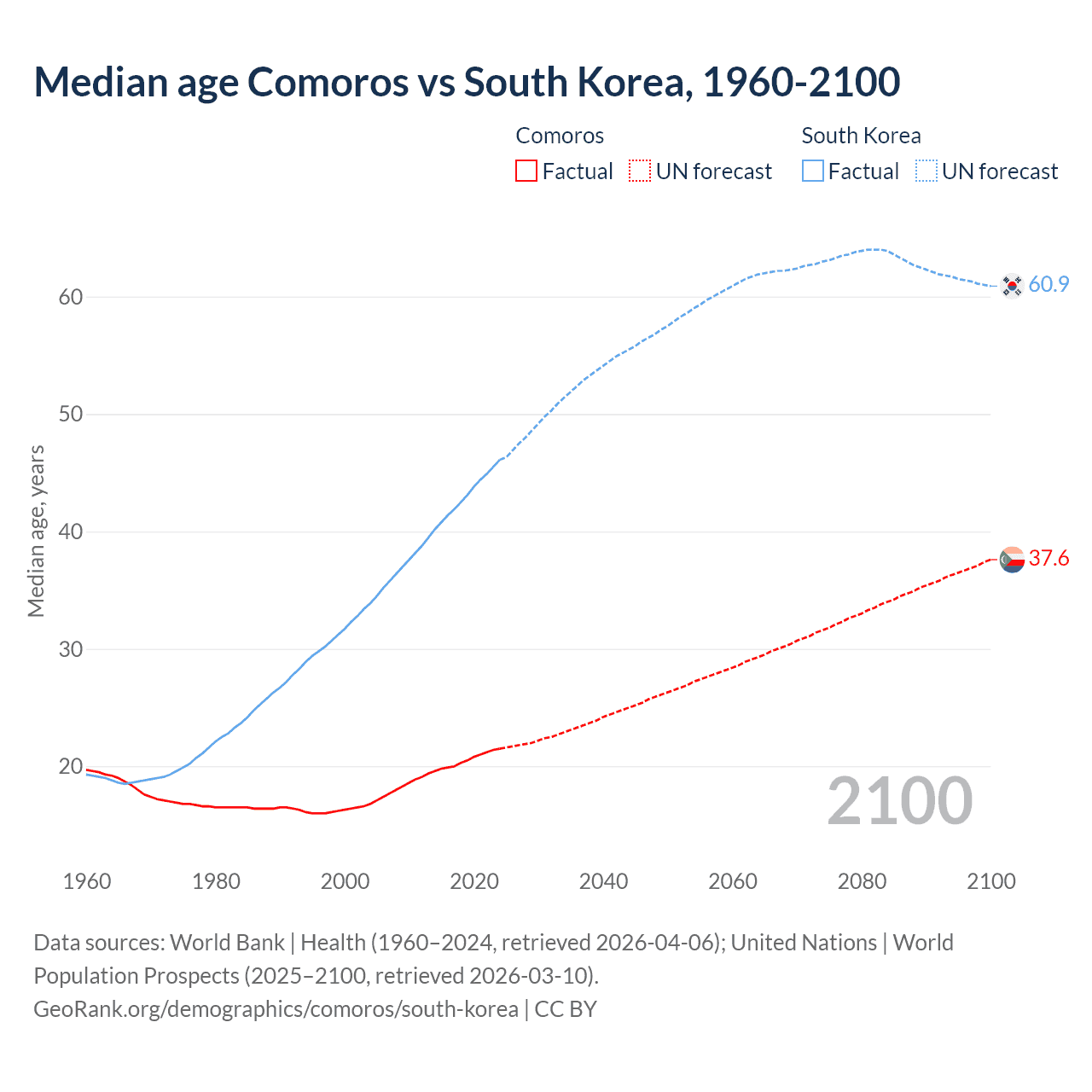 Median age Comoros vs South Korea, 1960-2100