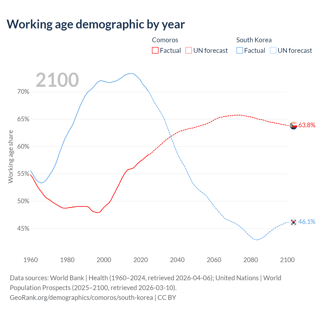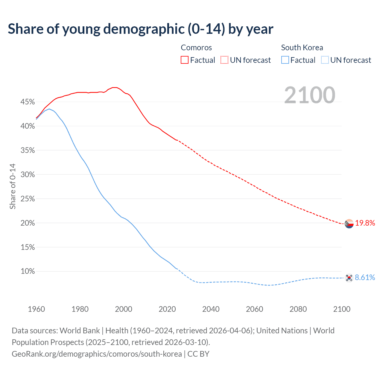 - The share of young demographic (0-15 years old) in Comoros is 37.1% vs 10.6% in South Korea.