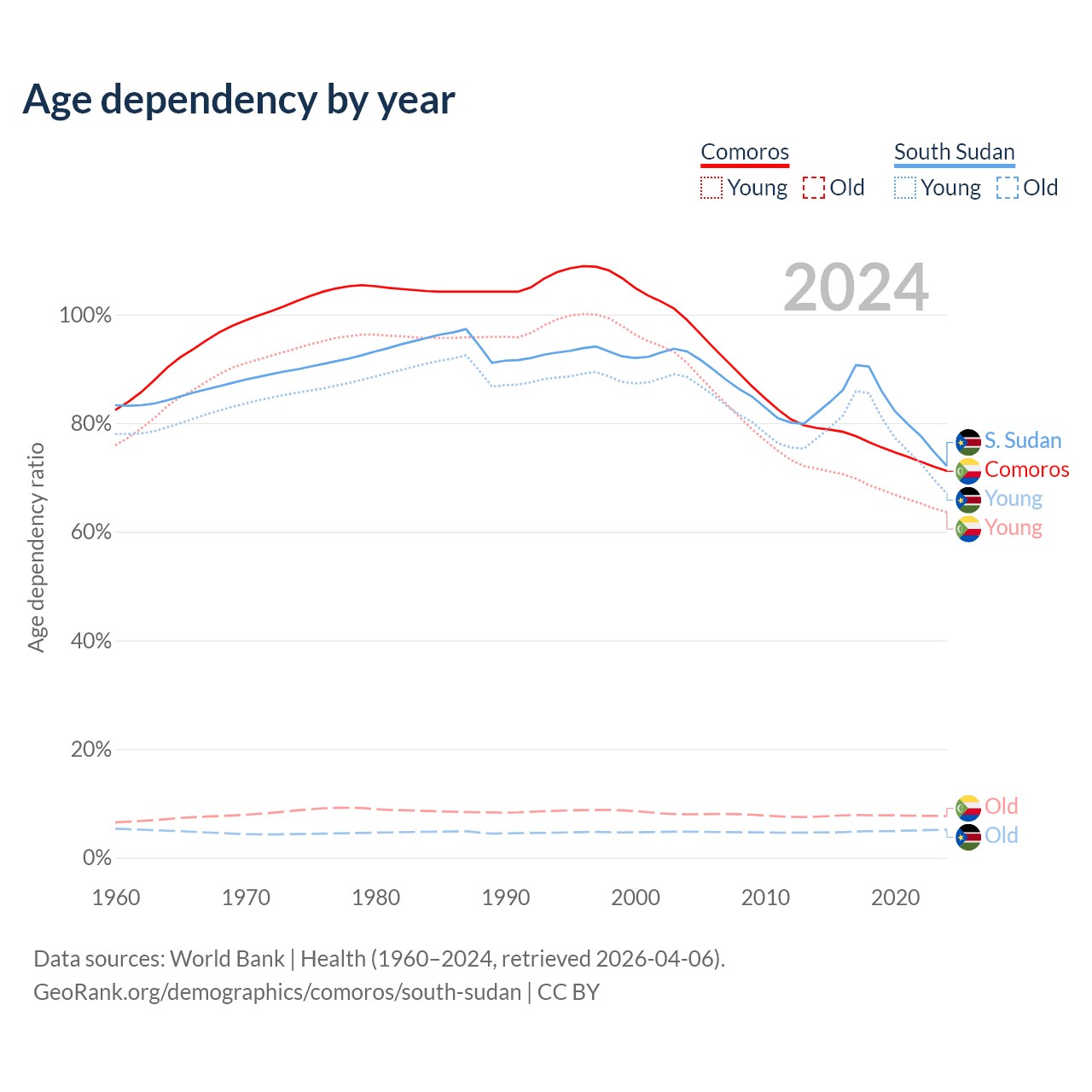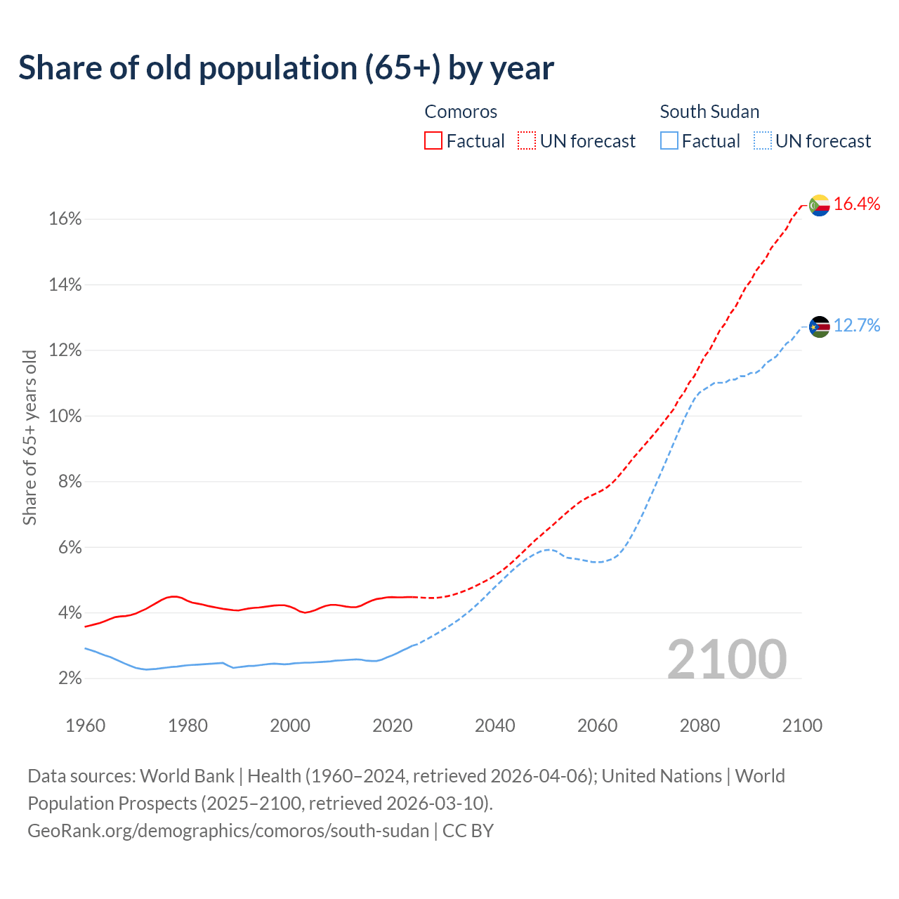 - The share of old-age demographic (65+) in Comoros is 4.47% vs 2.99% in South Sudan.