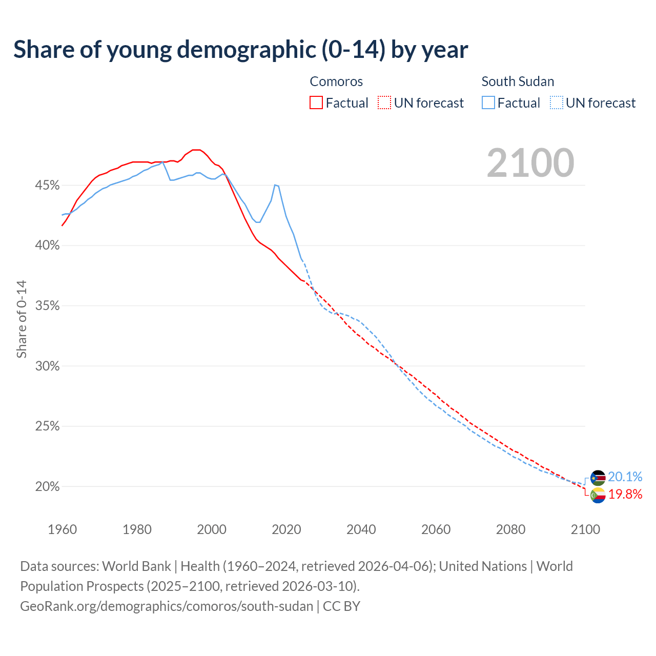 - The share of young demographic (0-15 years old) in Comoros is 37.1% vs 38.9% in South Sudan.