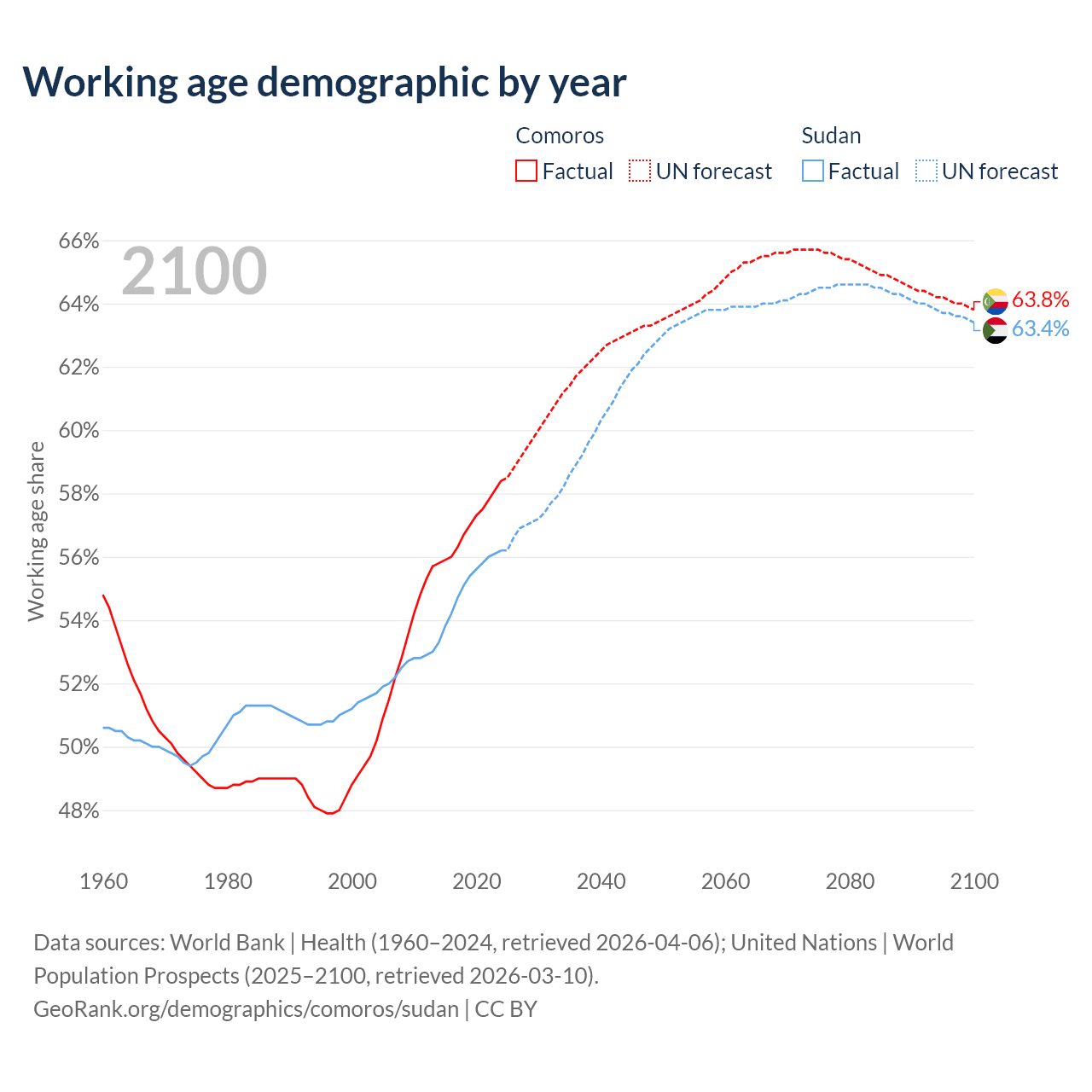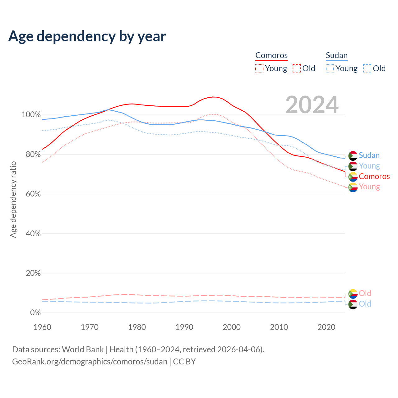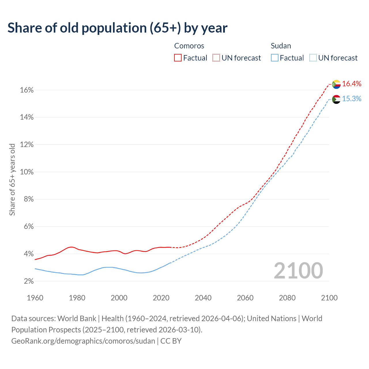 - The share of old-age demographic (65+) in Comoros is 4.47% vs 3.3% in Sudan.