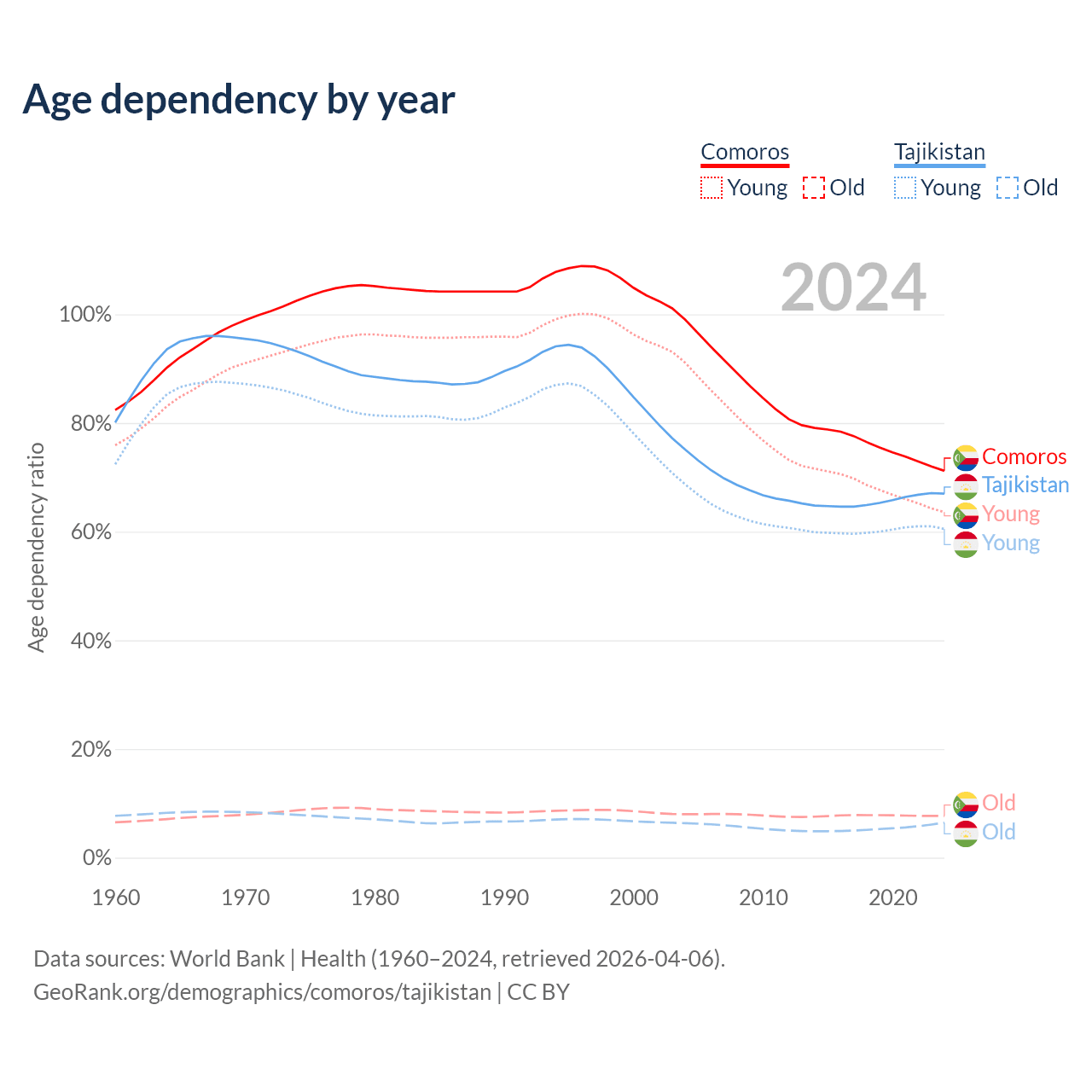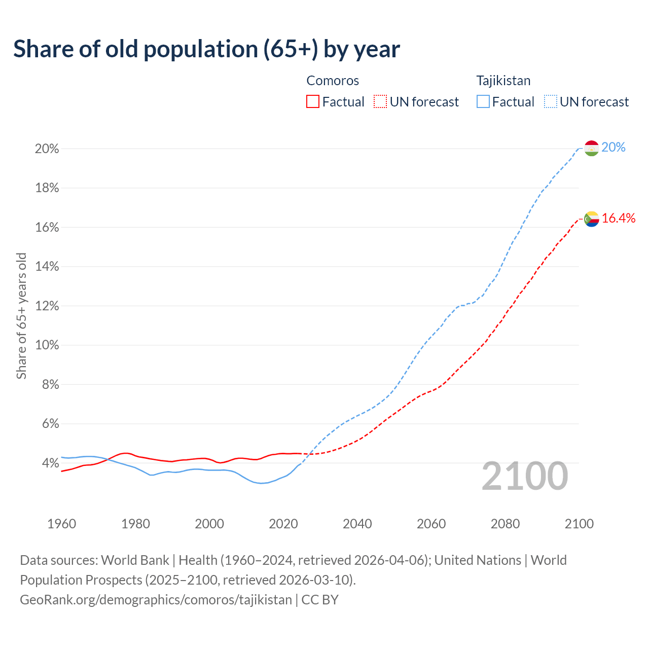 - The share of old-age demographic (65+) in Comoros is 4.47% vs 3.85% in Tajikistan.