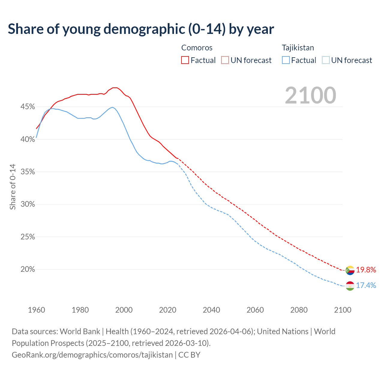 - The share of young demographic (0-15 years old) in Comoros is 37.1% vs 36.3% in Tajikistan.