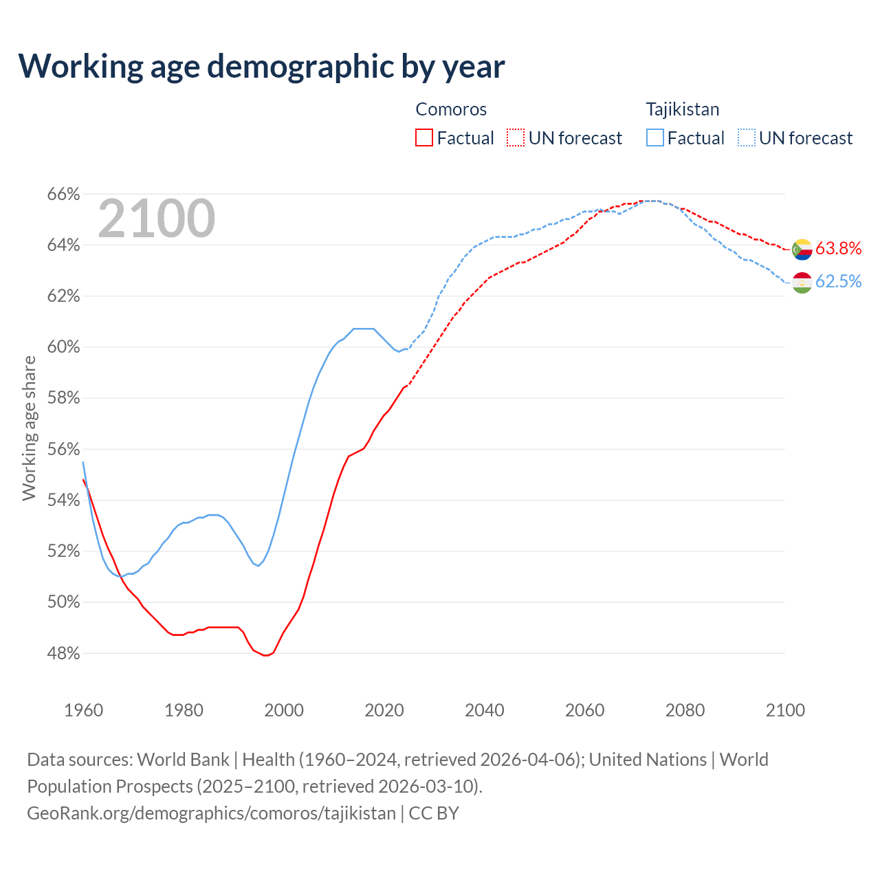 - Comoros has 528K working age adults (aged 15-64) vs 6.61M in Tajikistan.