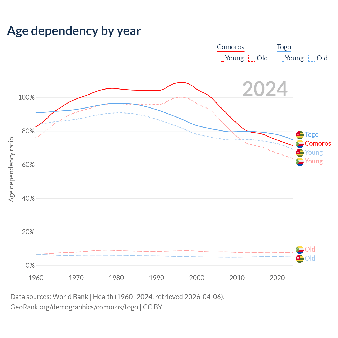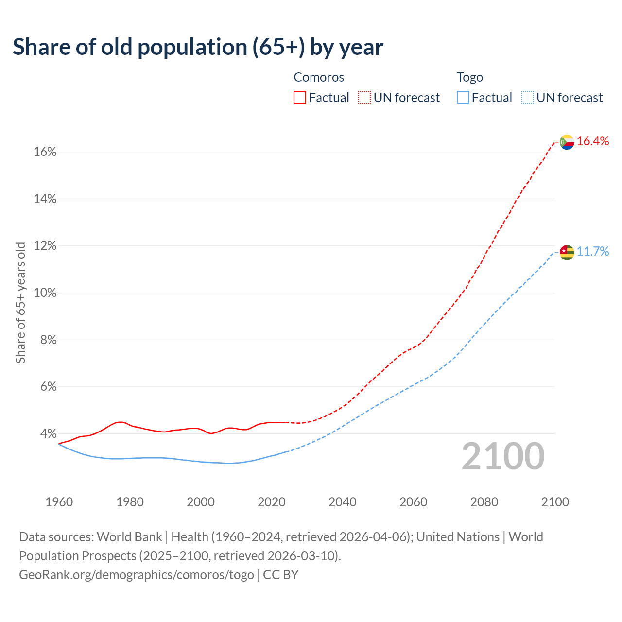 - The share of old-age demographic (65+) in Comoros is 4.47% vs 3.21% in Togo.
