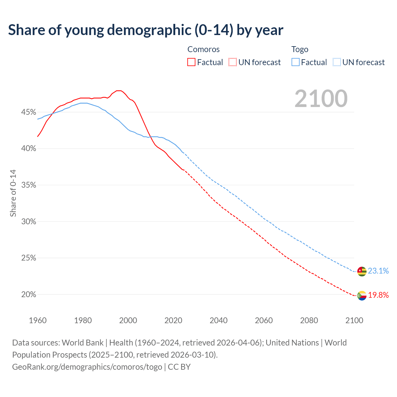 - The share of young demographic (0-15 years old) in Comoros is 37.1% vs 39.5% in Togo.