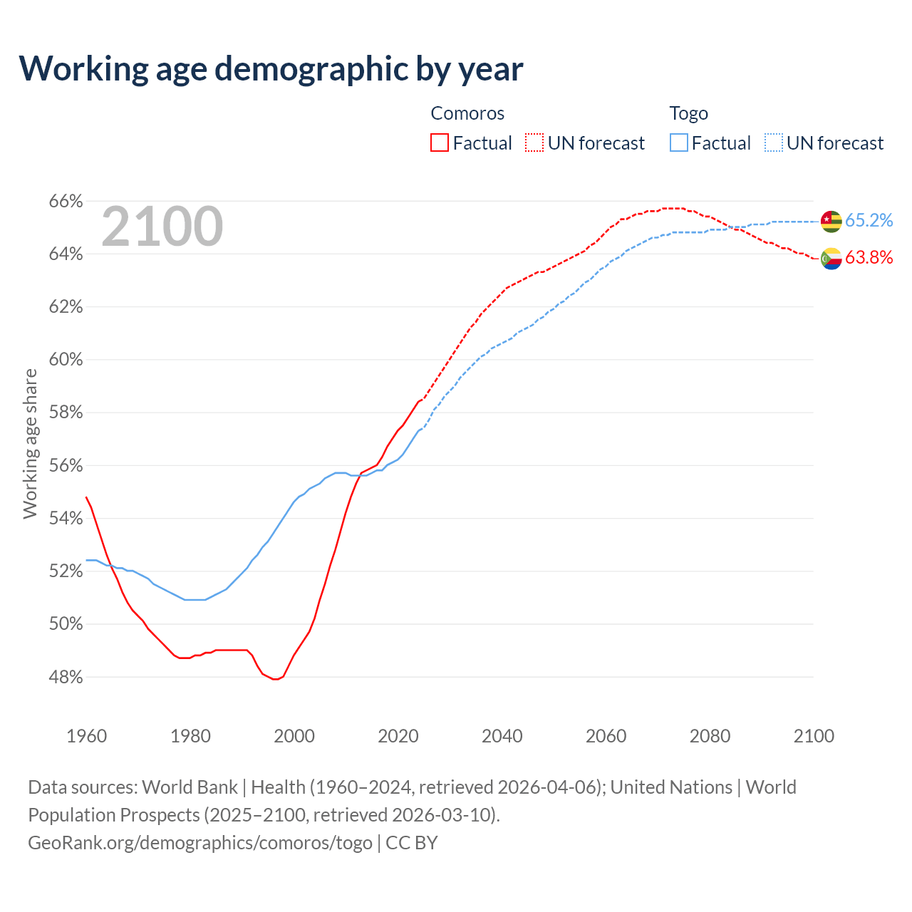 - Comoros has 528K working age adults (aged 15-64) vs 5.72M in Togo.