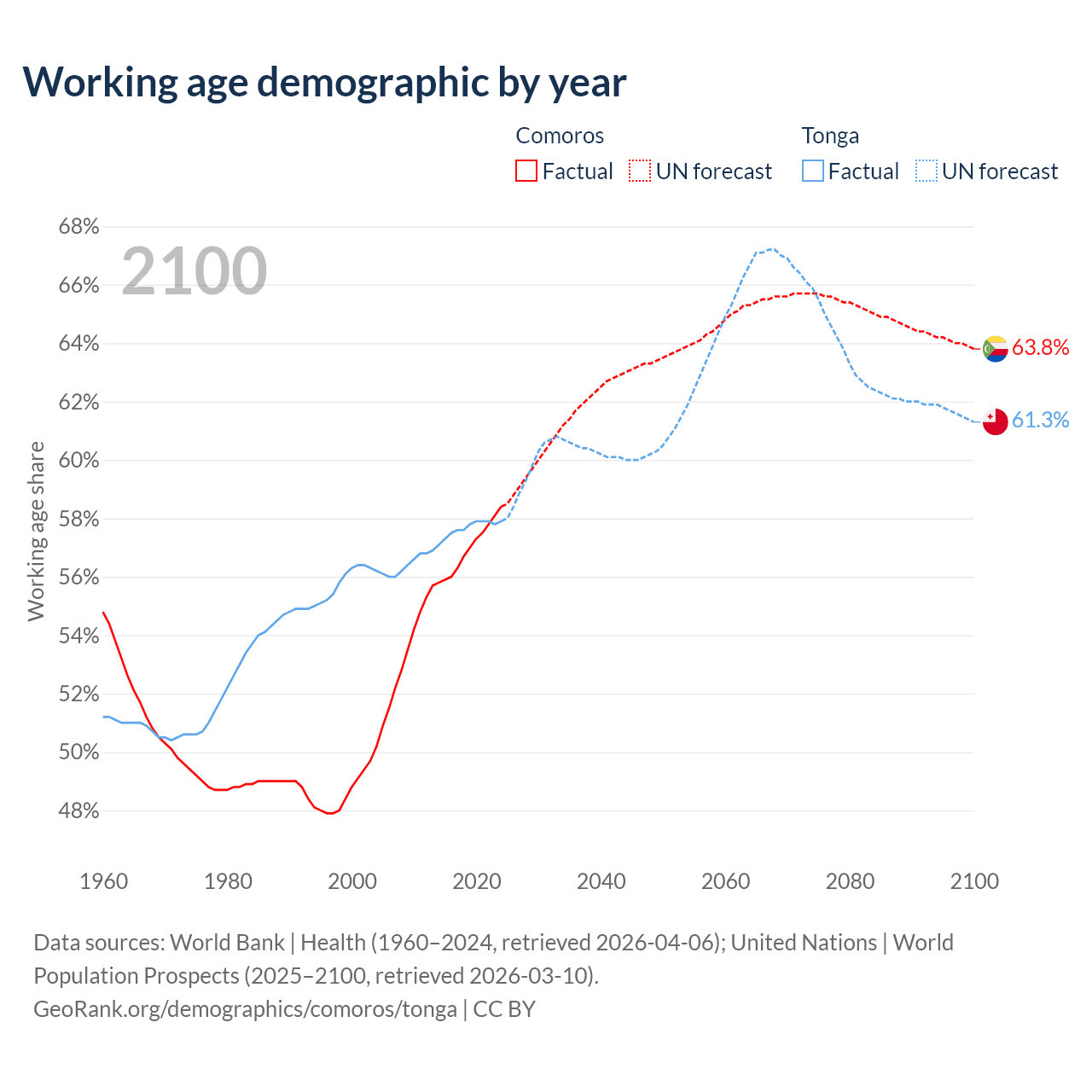 - Comoros has 528K working age adults (aged 15-64) vs 59.8K in Tonga.