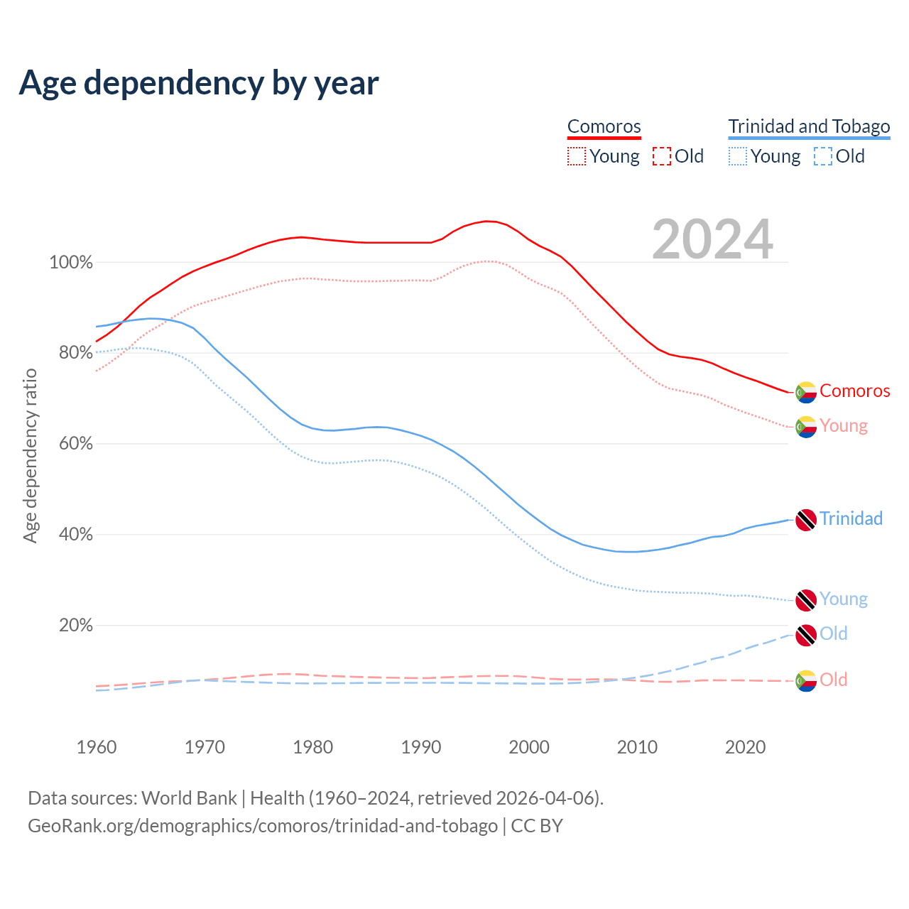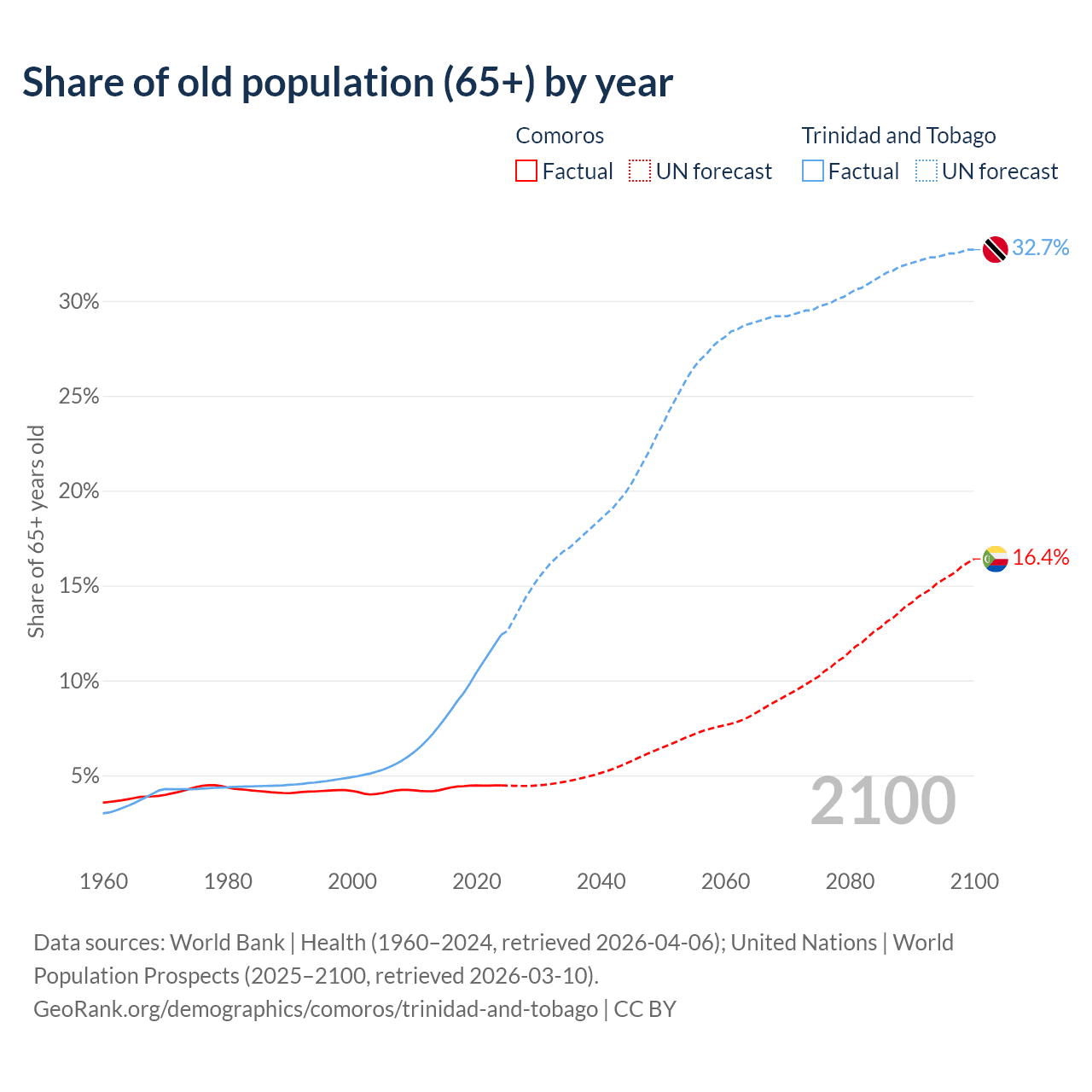 - The share of old-age demographic (65+) in Comoros is 4.47% vs 12.4% in Trinidad and Tobago.