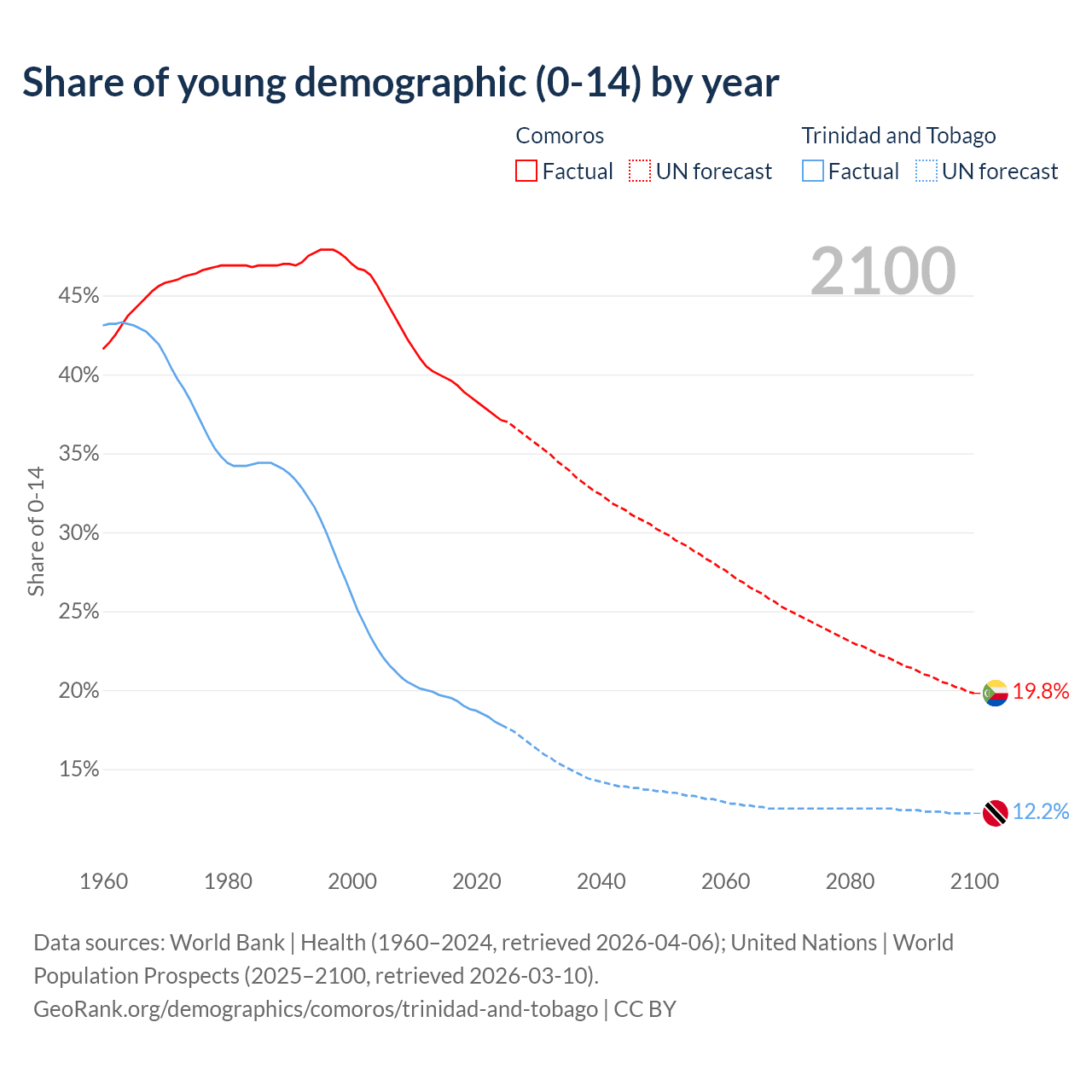- The share of young demographic (0-15 years old) in Comoros is 37.1% vs 17.8% in Trinidad and Tobago.