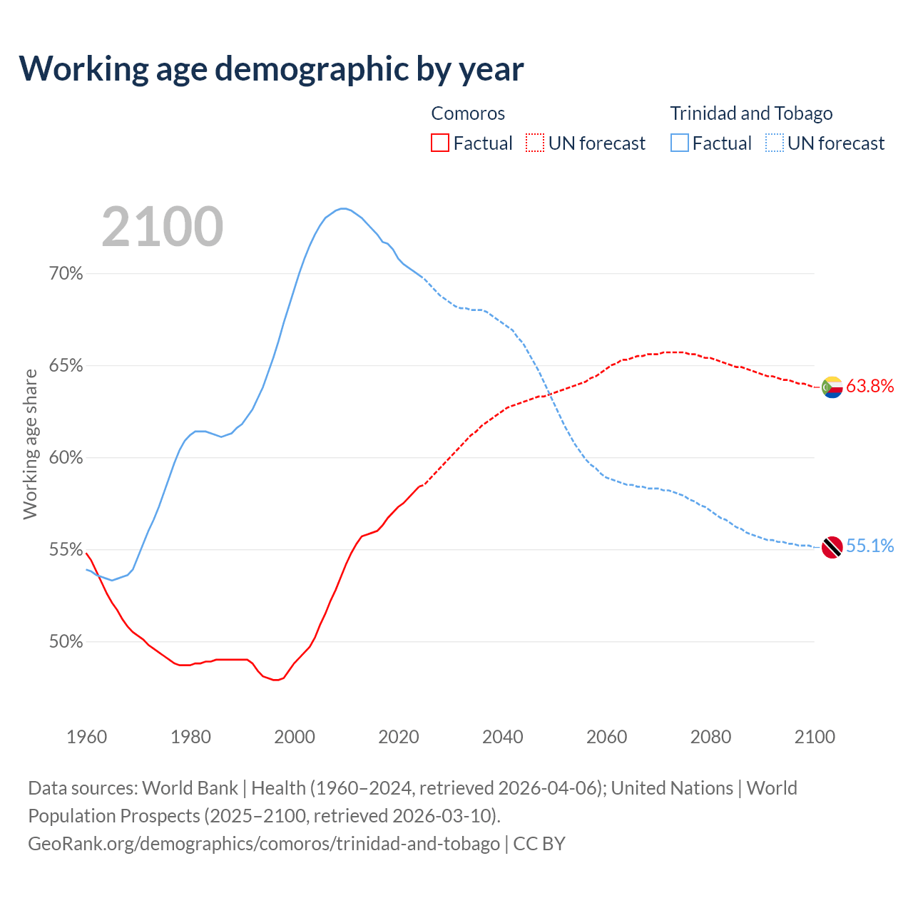 - Comoros has 528K working age adults (aged 15-64) vs 960K in Trinidad and Tobago.