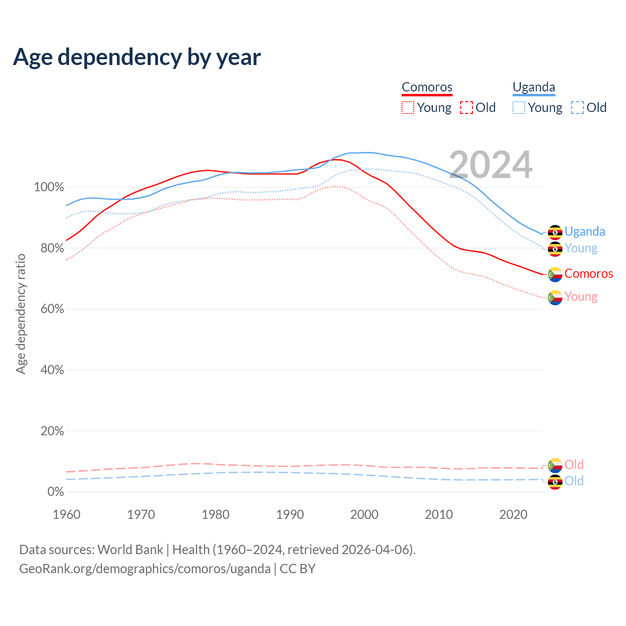 - The share of old-age demographic (65+) in Comoros is 4.47% vs 2.19% in Uganda.