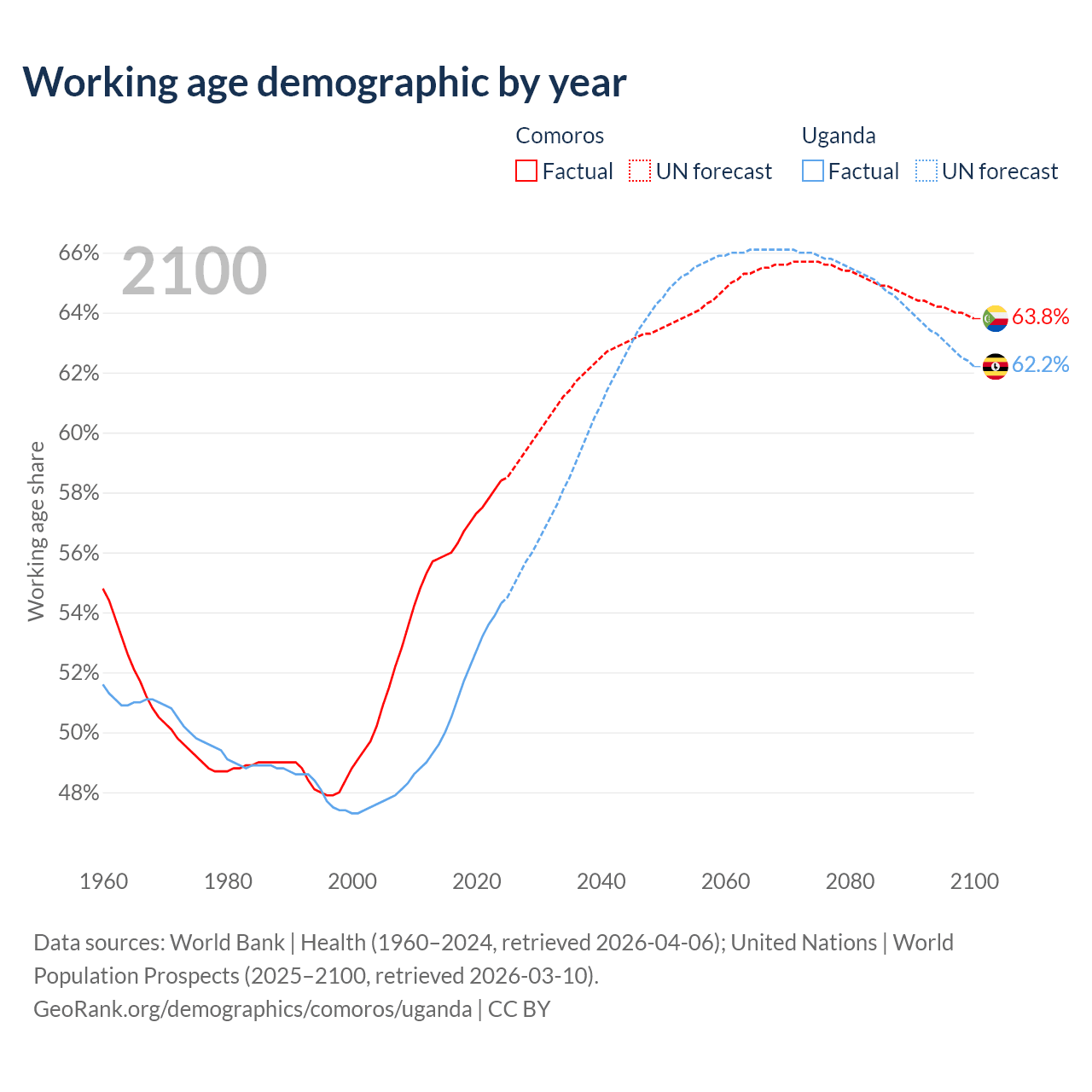 The share of older people aged 65 and over is 4.47% in Comoros and 2.19% in Uganda. Life expectancy in Comoros compared to Uganda .
