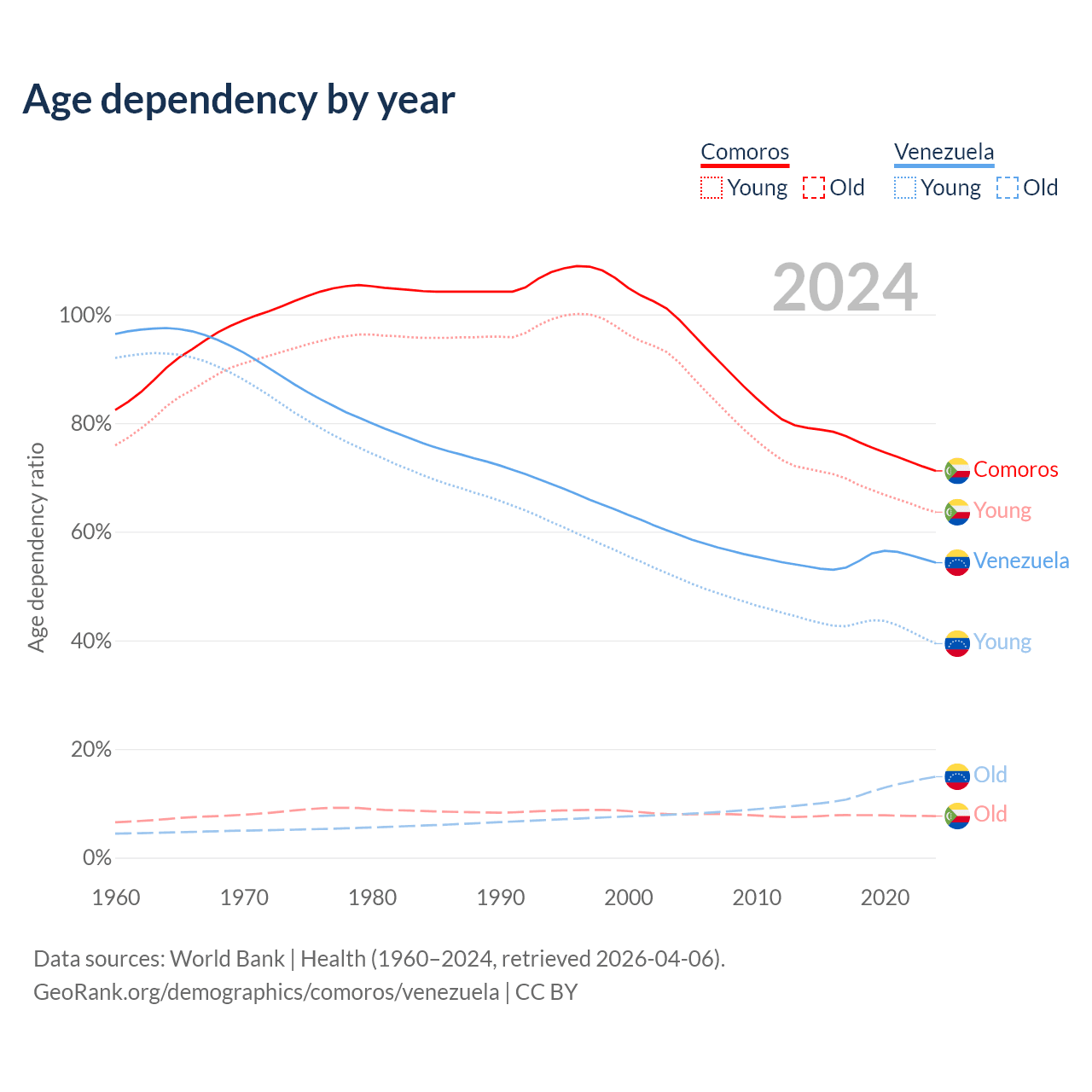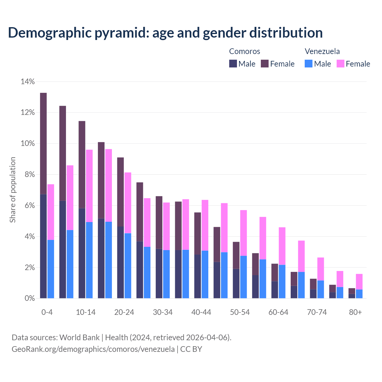 - Comoros is ranked 152/196 by median age (oldest to youngest) vs 104/196 for Venezuela.