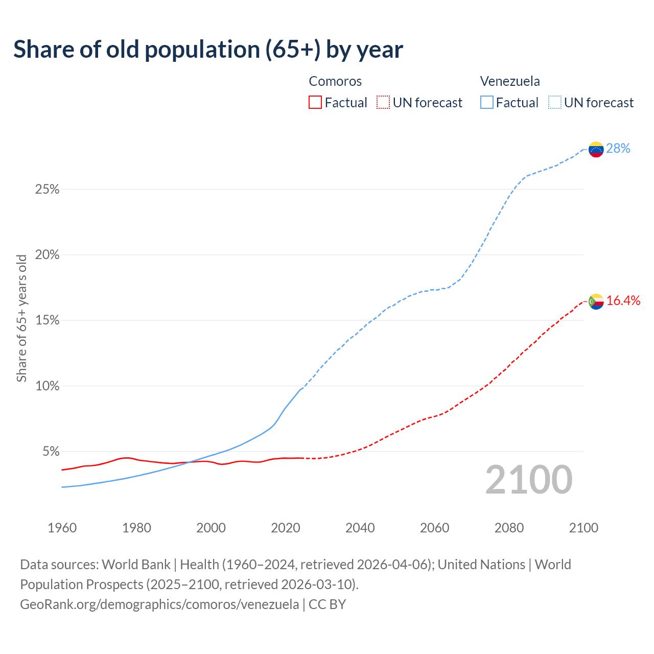 - The share of old-age demographic (65+) in Comoros is 4.47% vs 9.68% in Venezuela.