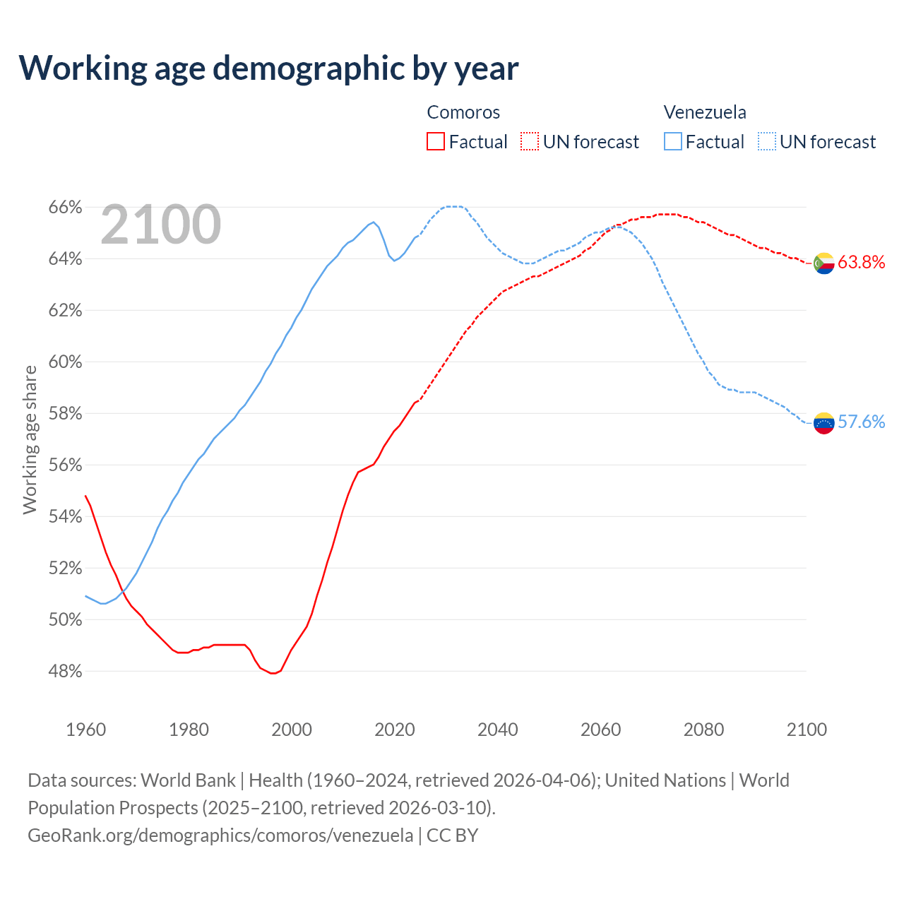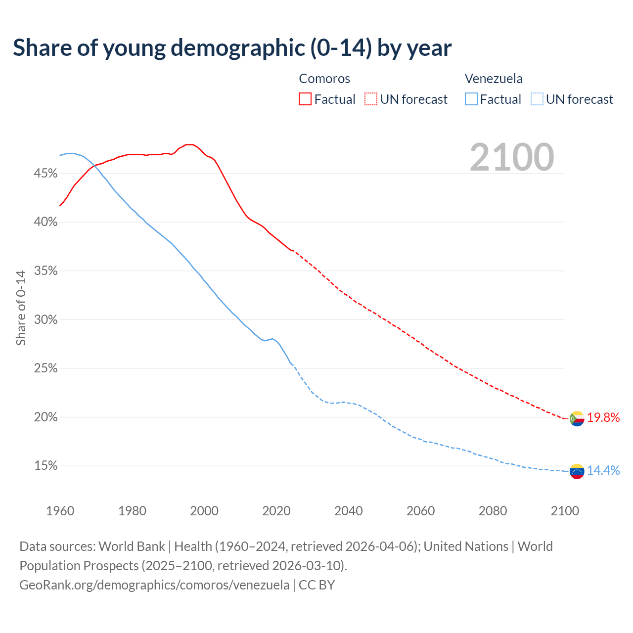 - The share of young demographic (0-15 years old) in Comoros is 37.1% vs 25.5% in Venezuela.