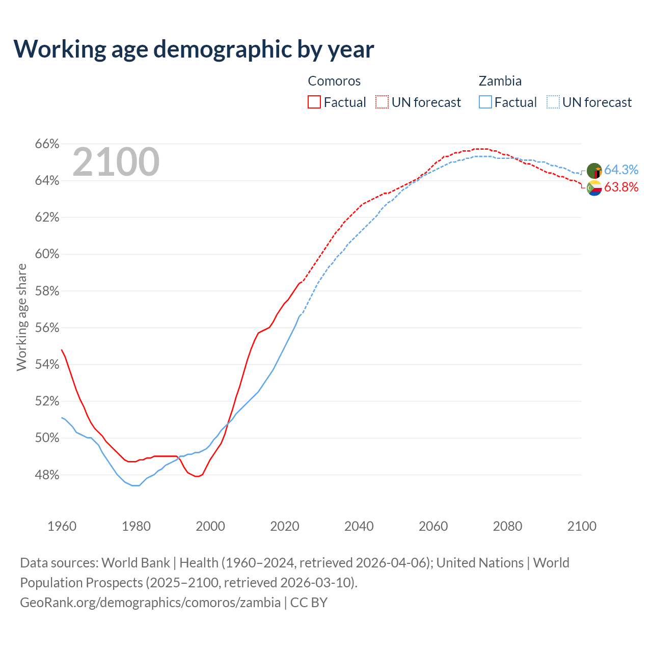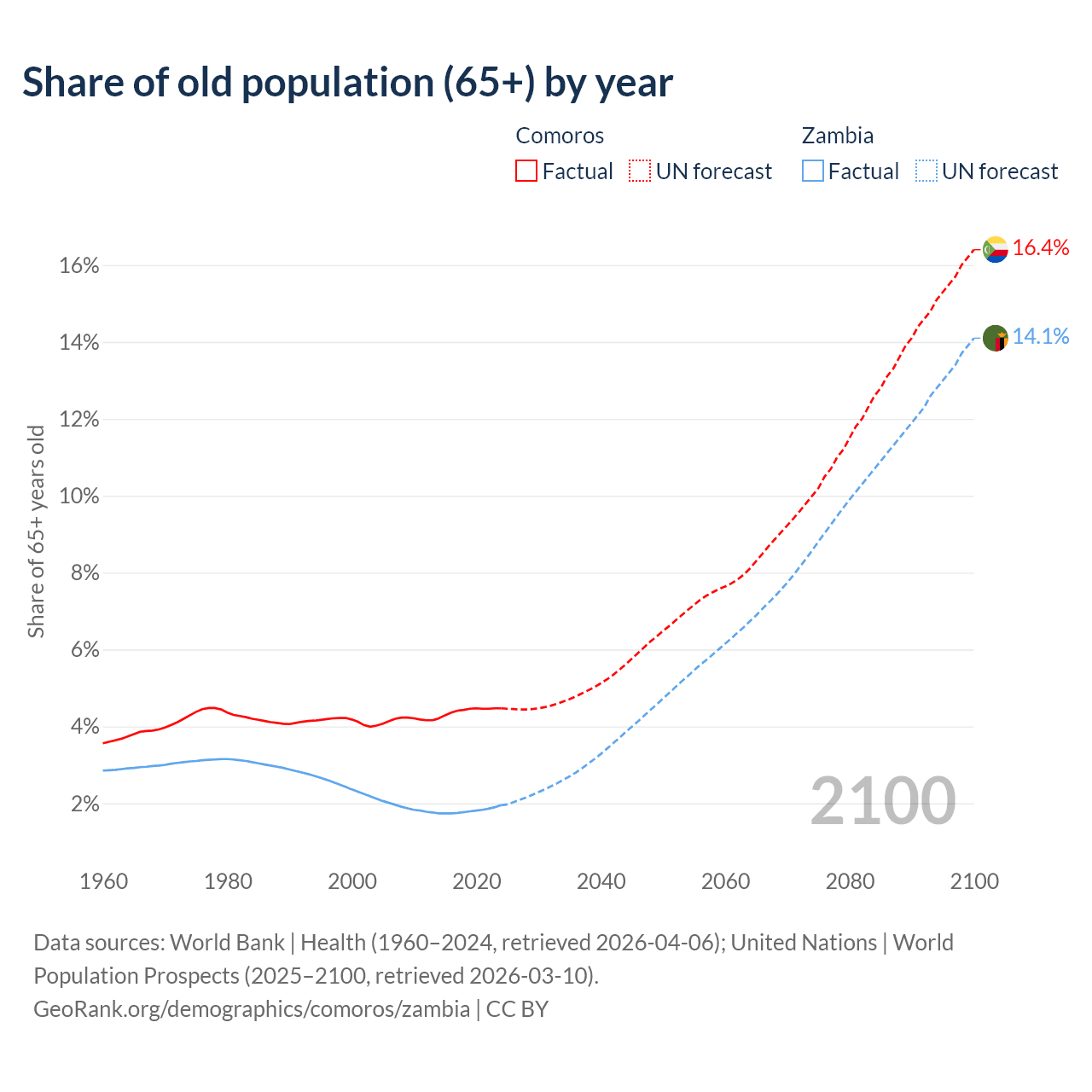 - The share of old-age demographic (65+) in Comoros is 4.47% vs 1.95% in Zambia.