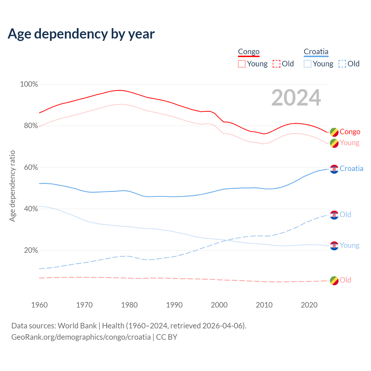 - The share of old-age demographic (65+) in the Congo is 2.99% vs 23.2% in Croatia.