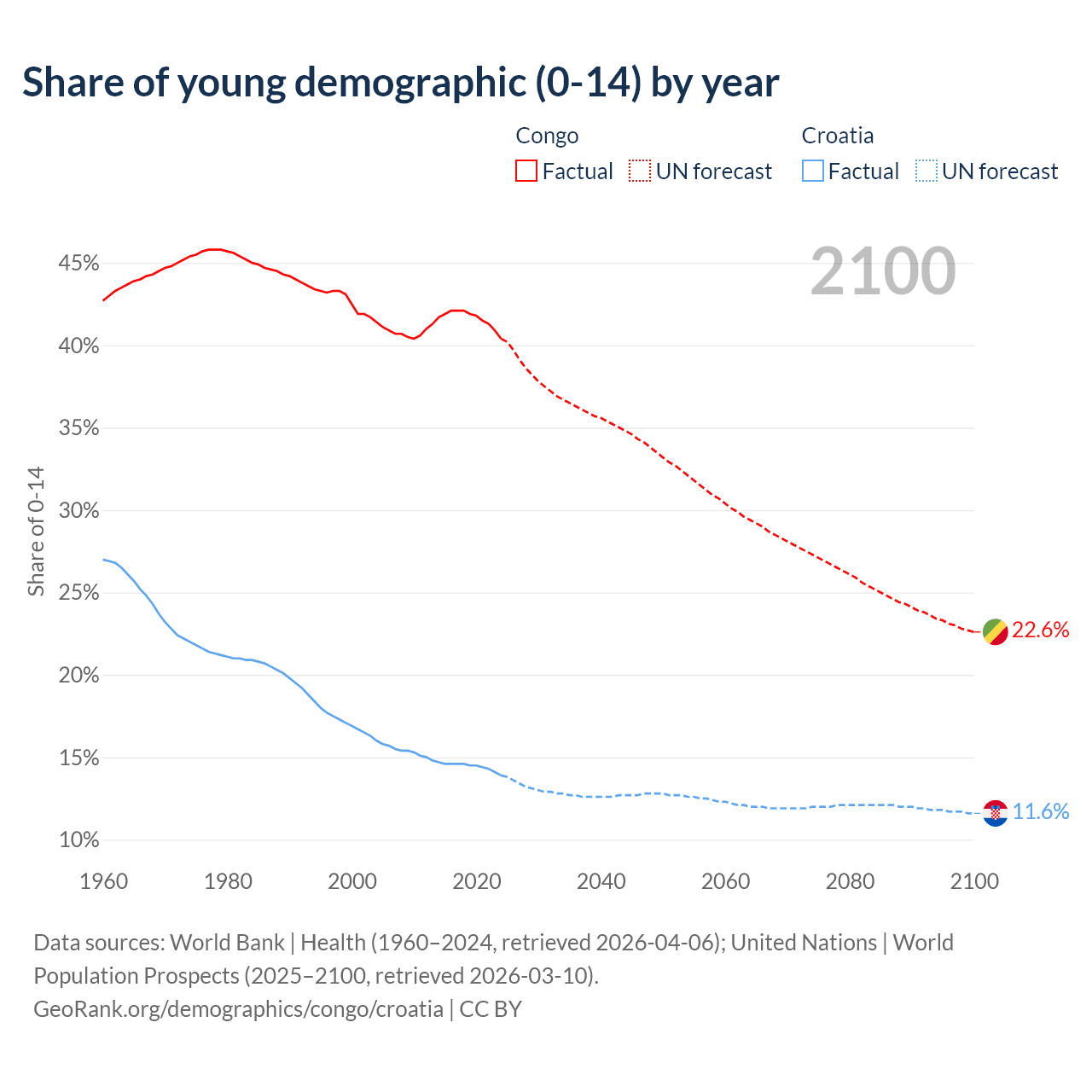 - The share of young demographic (0-15 years old) in the Congo is 40.4% vs 13.9% in Croatia.