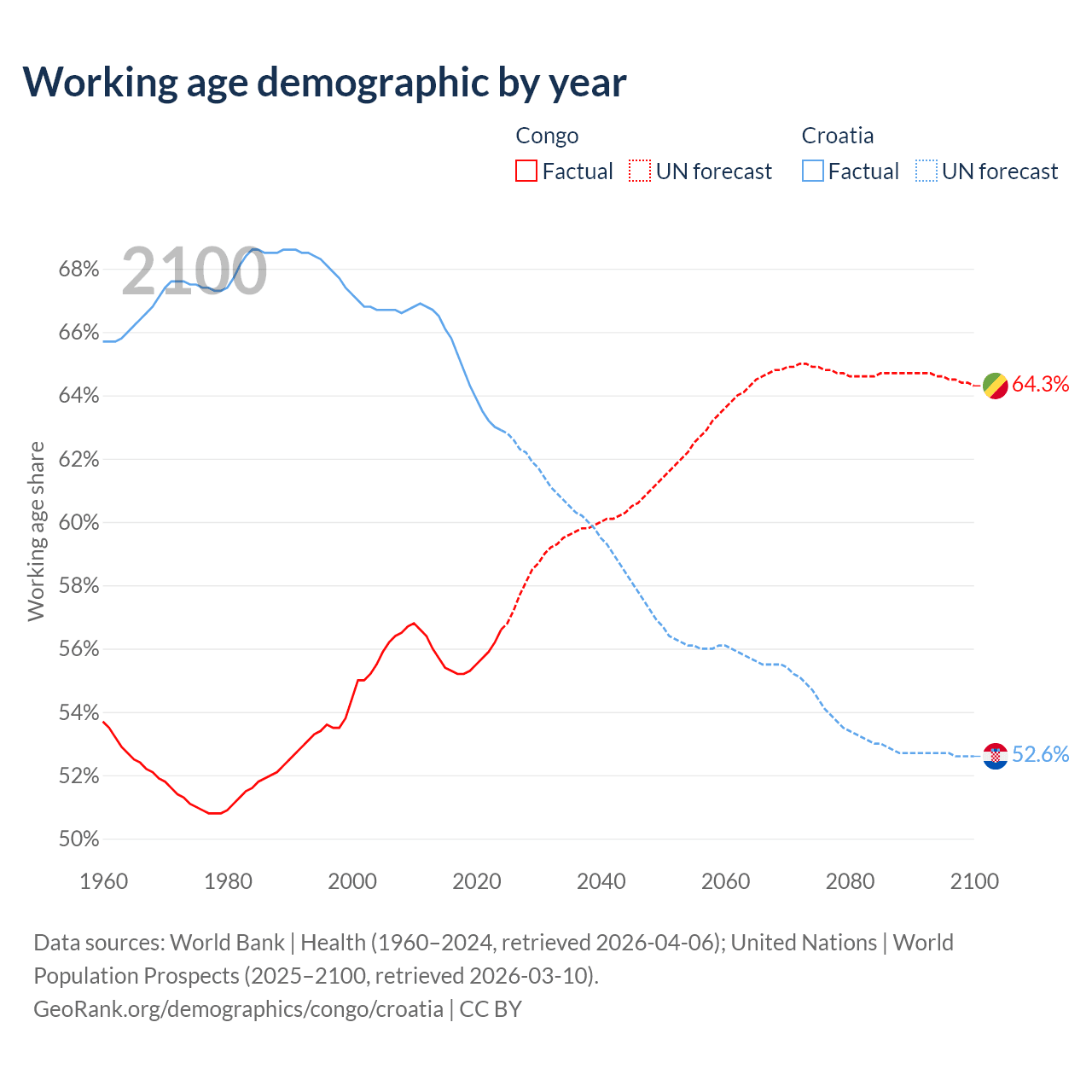 Median age Congo vs Croatia, 1960-2100
