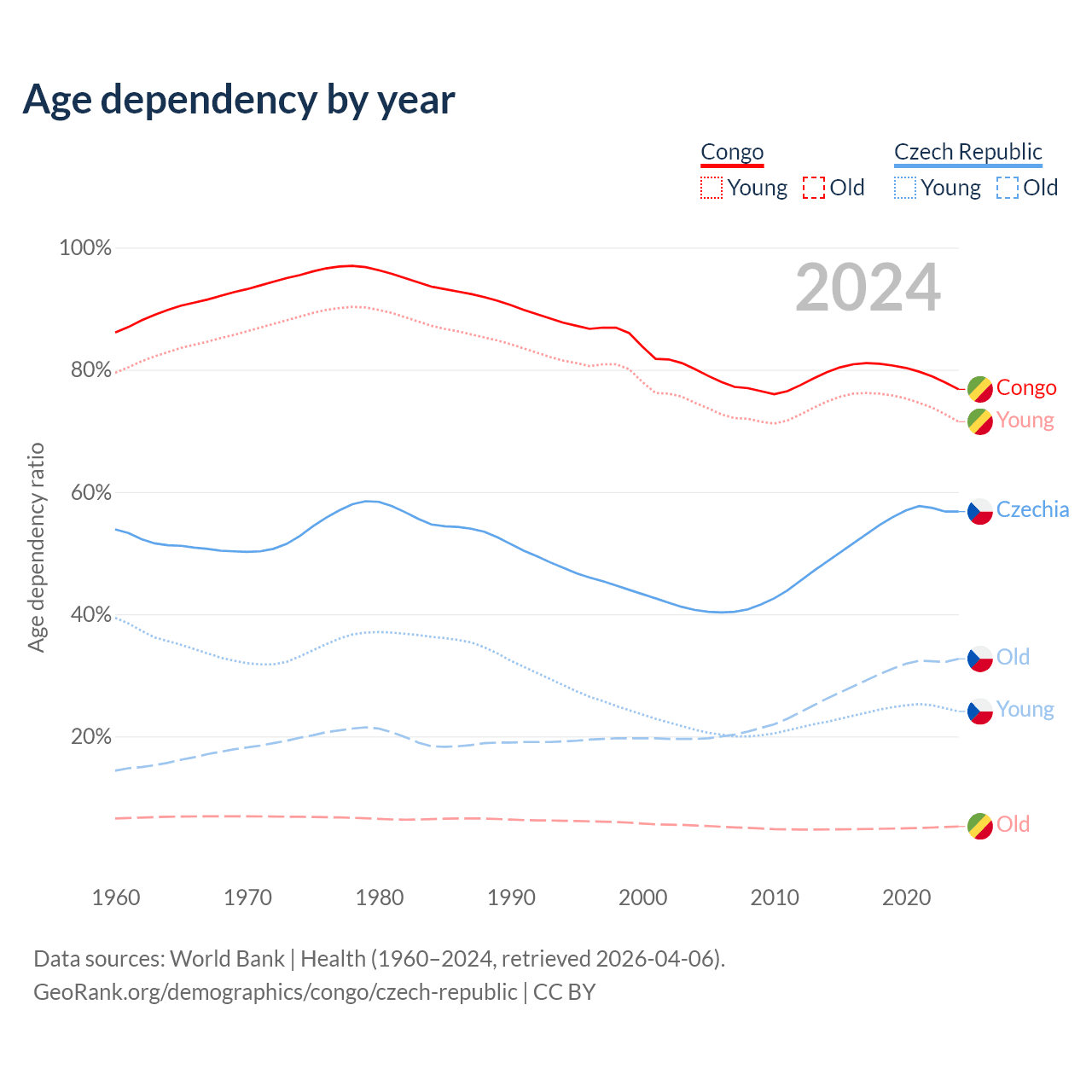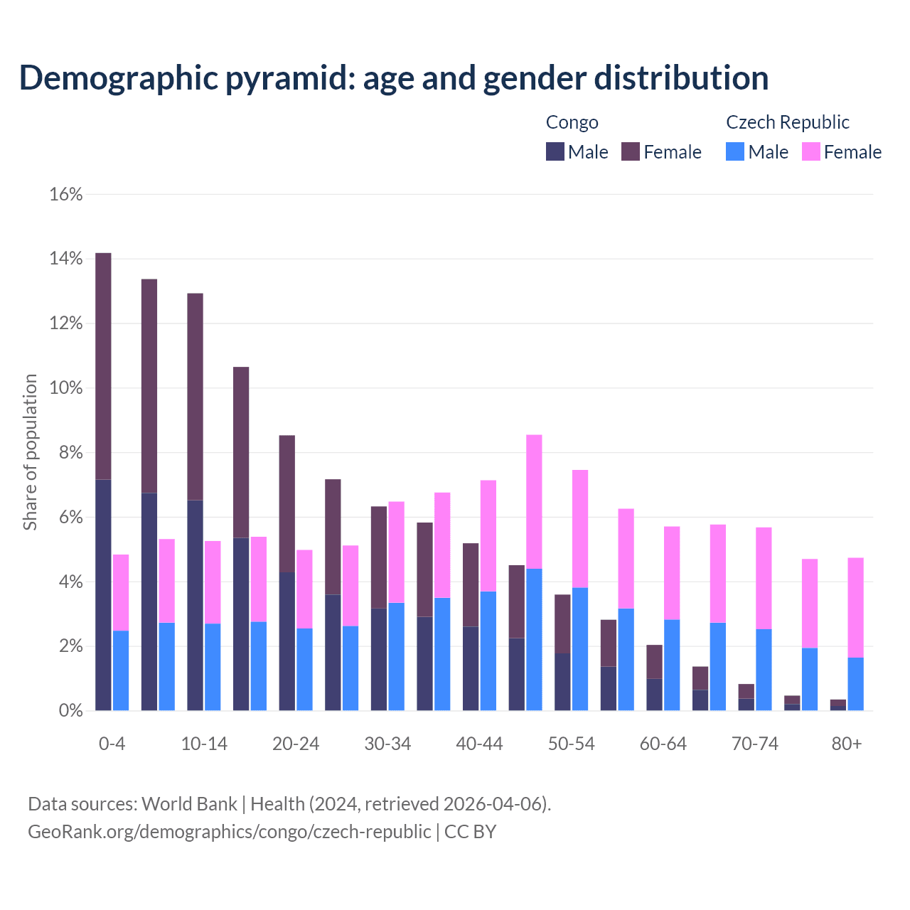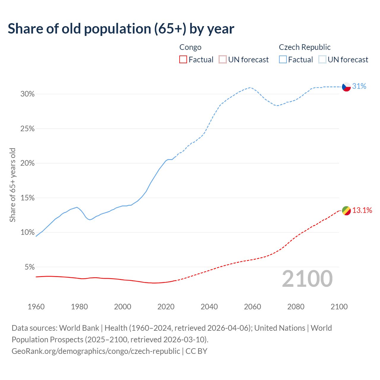 - The share of old-age demographic (65+) in the Congo is 2.99% vs 20.8% in the Czech Republic.
