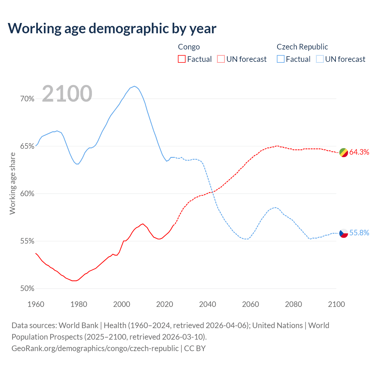 - The Congo has 3.78M working age adults (aged 15-64) vs 6.79M in the Czech Republic.