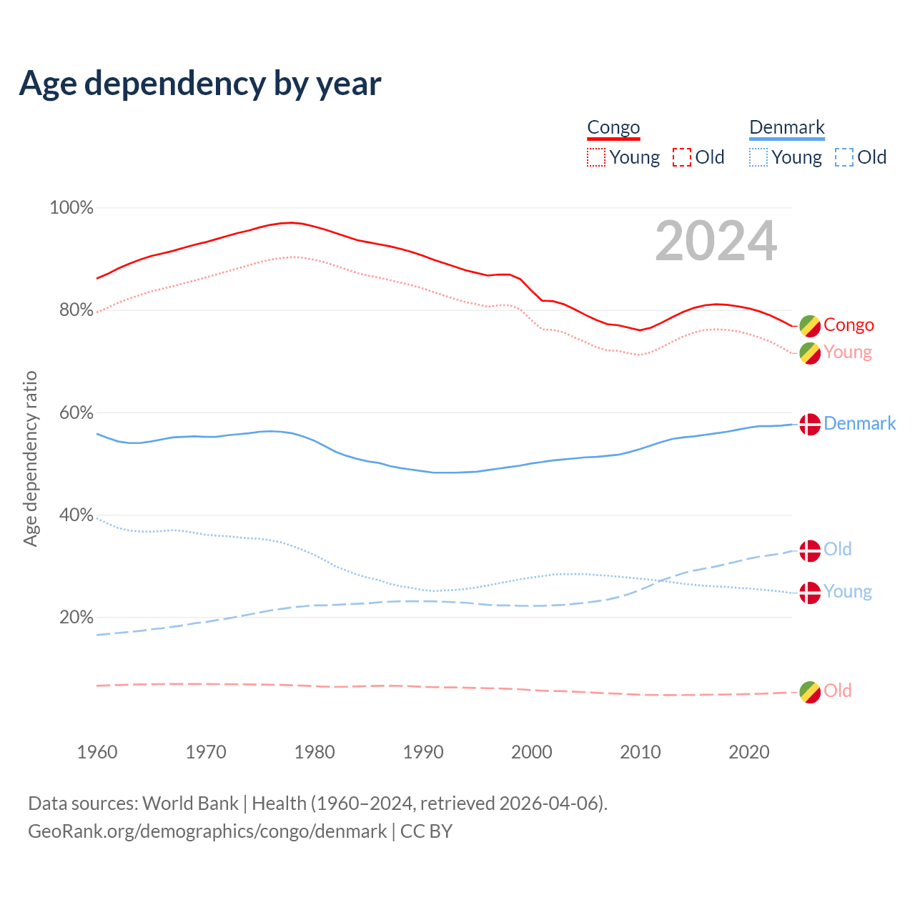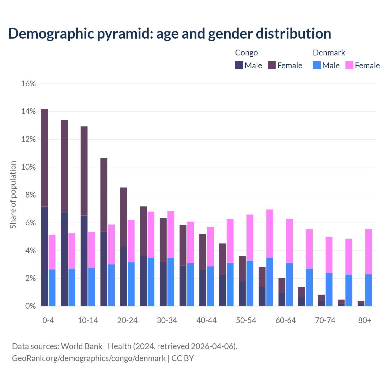 - The Congo is ranked 170/196 by median age (oldest to youngest) vs 34/196 for Denmark.