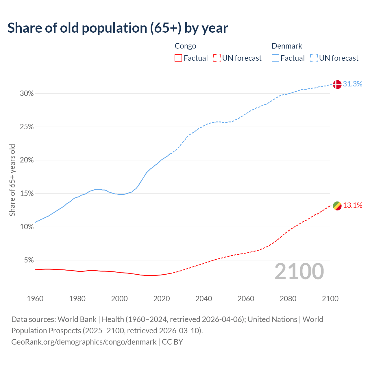 - The share of old-age demographic (65+) in the Congo is 2.99% vs 20.9% in Denmark.