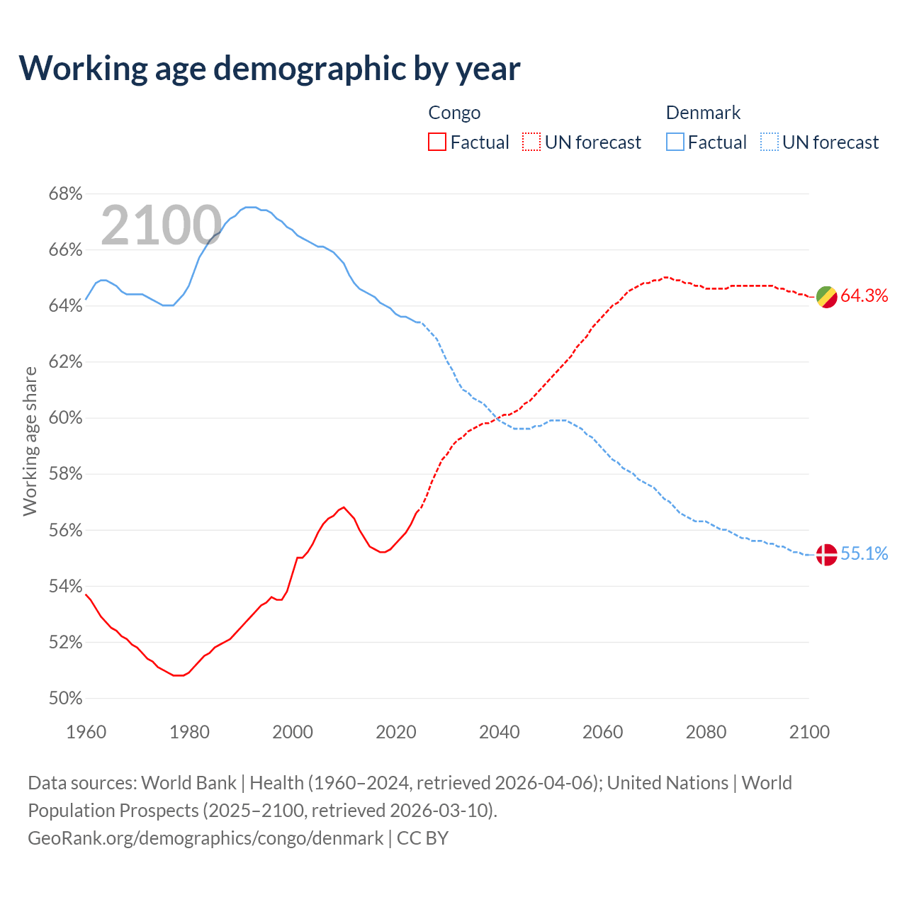 - The Congo has 3.78M working age adults (aged 15-64) vs 3.83M in Denmark.