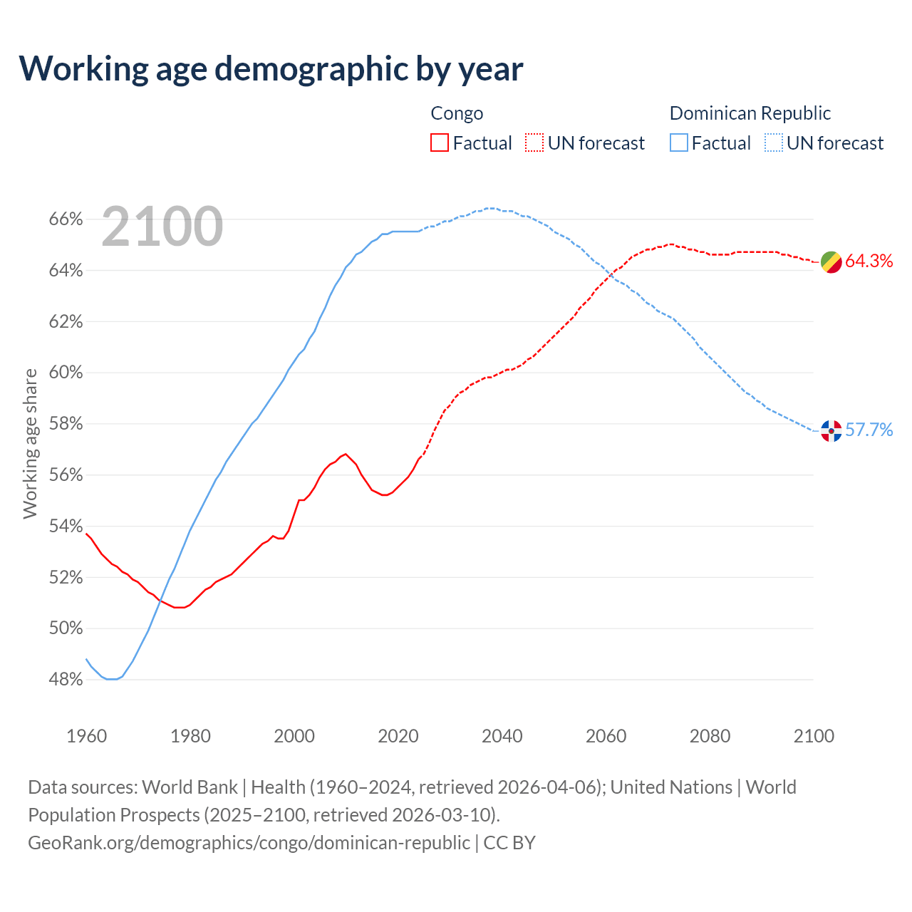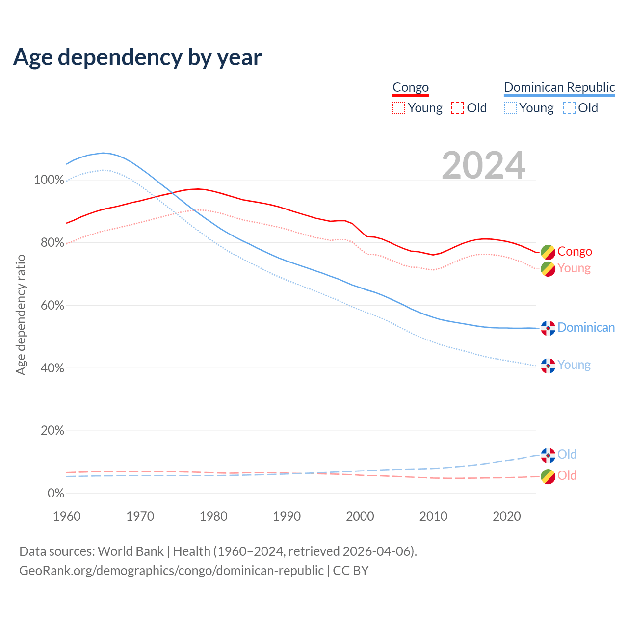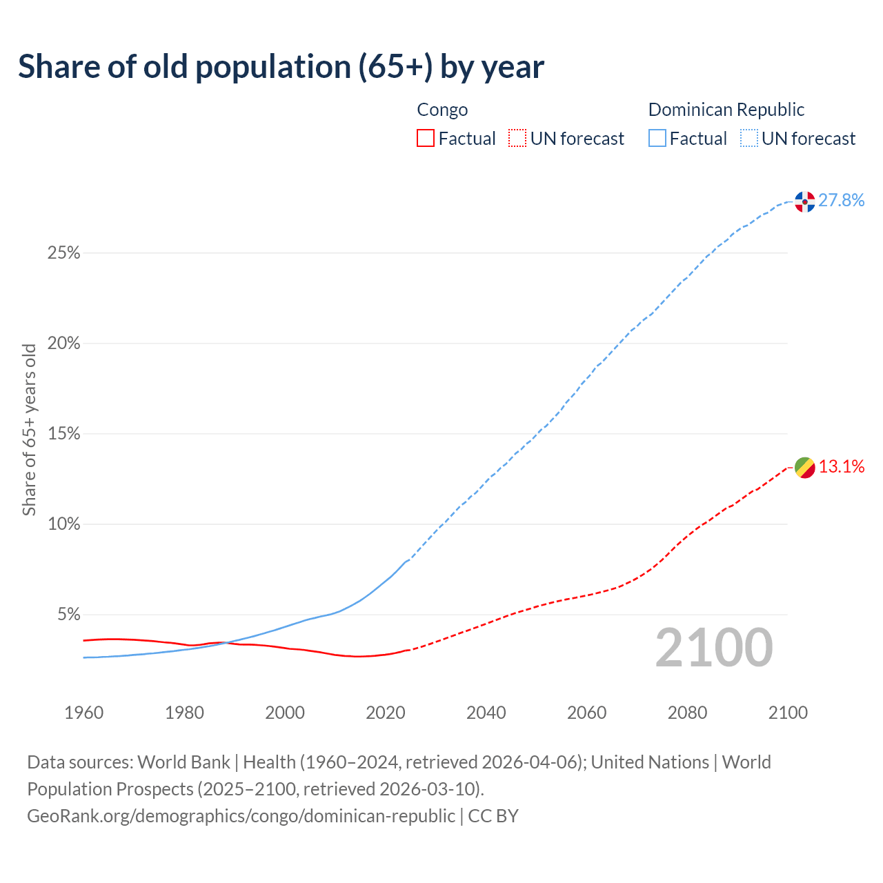 - The share of old-age demographic (65+) in the Congo is 2.99% vs 7.88% in the Dominican Republic.