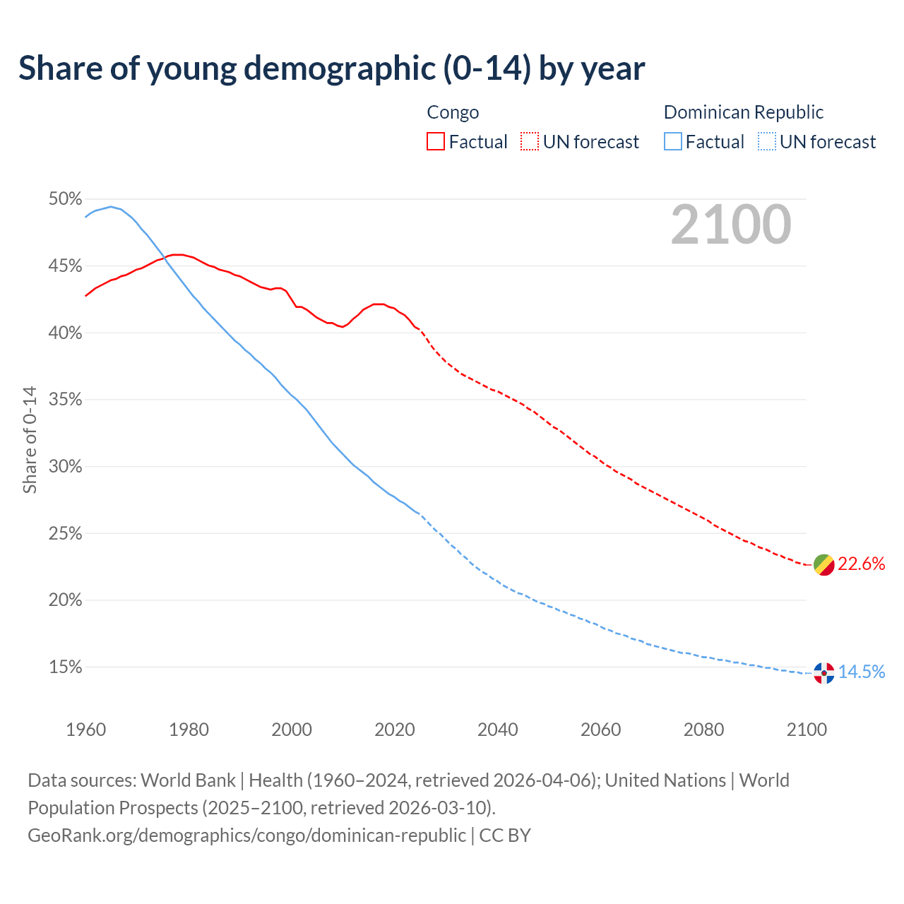 - The share of young demographic (0-15 years old) in the Congo is 40.4% vs 26.6% in the Dominican Republic.