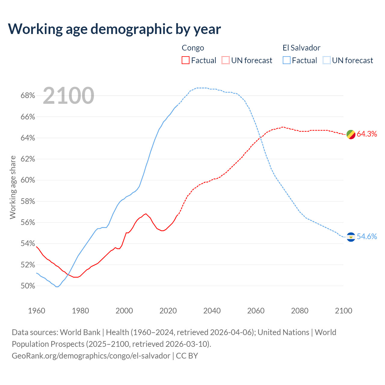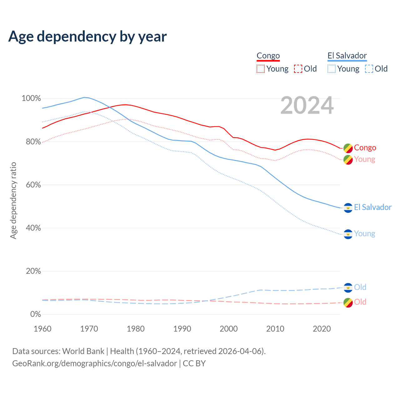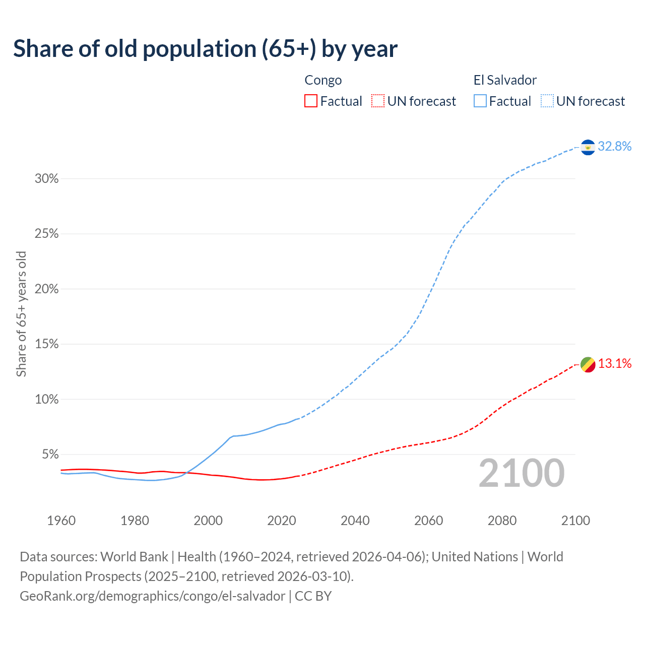 - The share of old-age demographic (65+) in the Congo is 2.99% vs 8.15% in El Salvador.