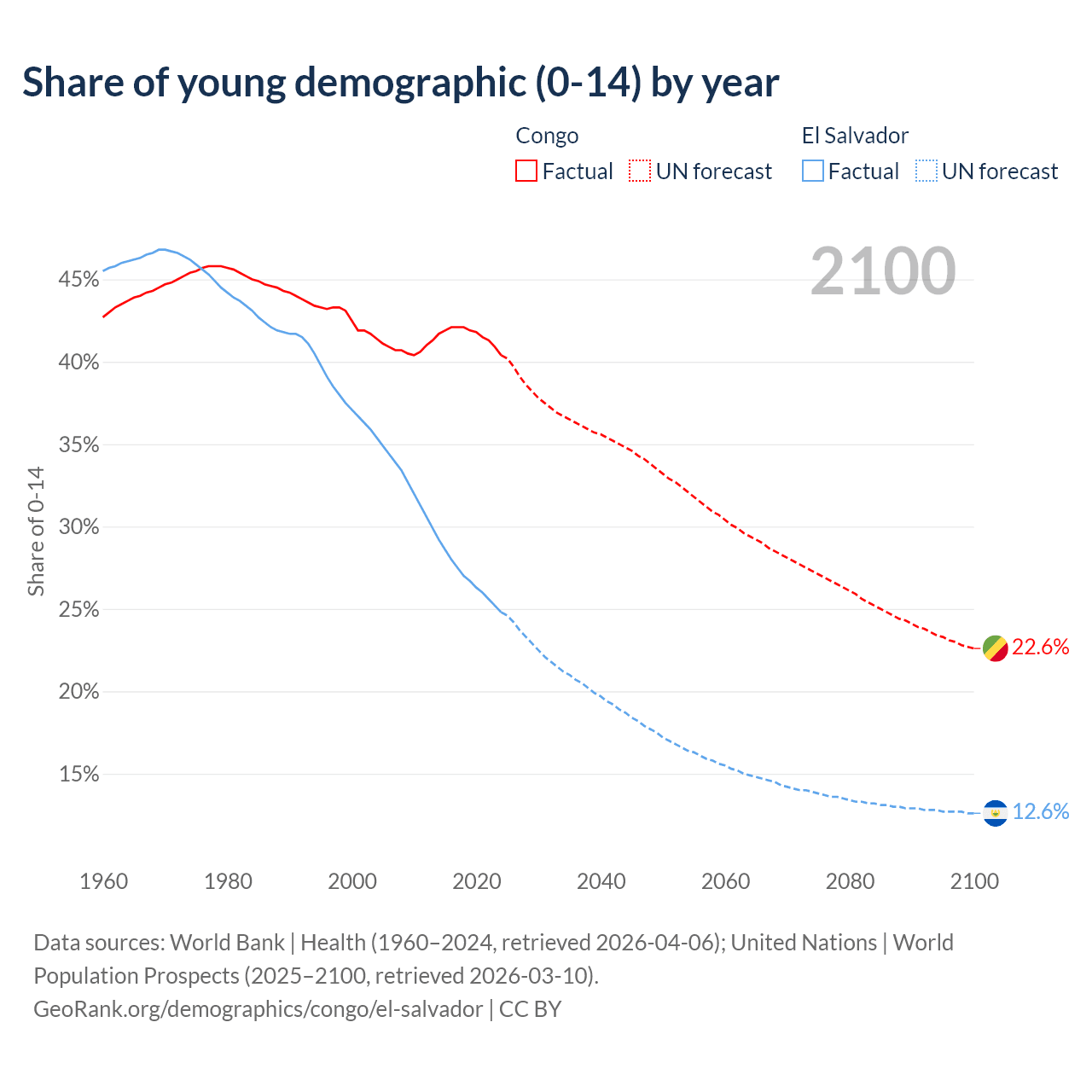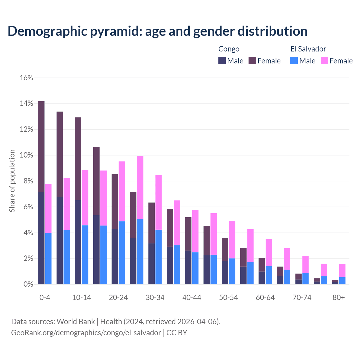 - The share of young demographic (0-15 years old) in the Congo is 40.4% vs 24.8% in El Salvador.