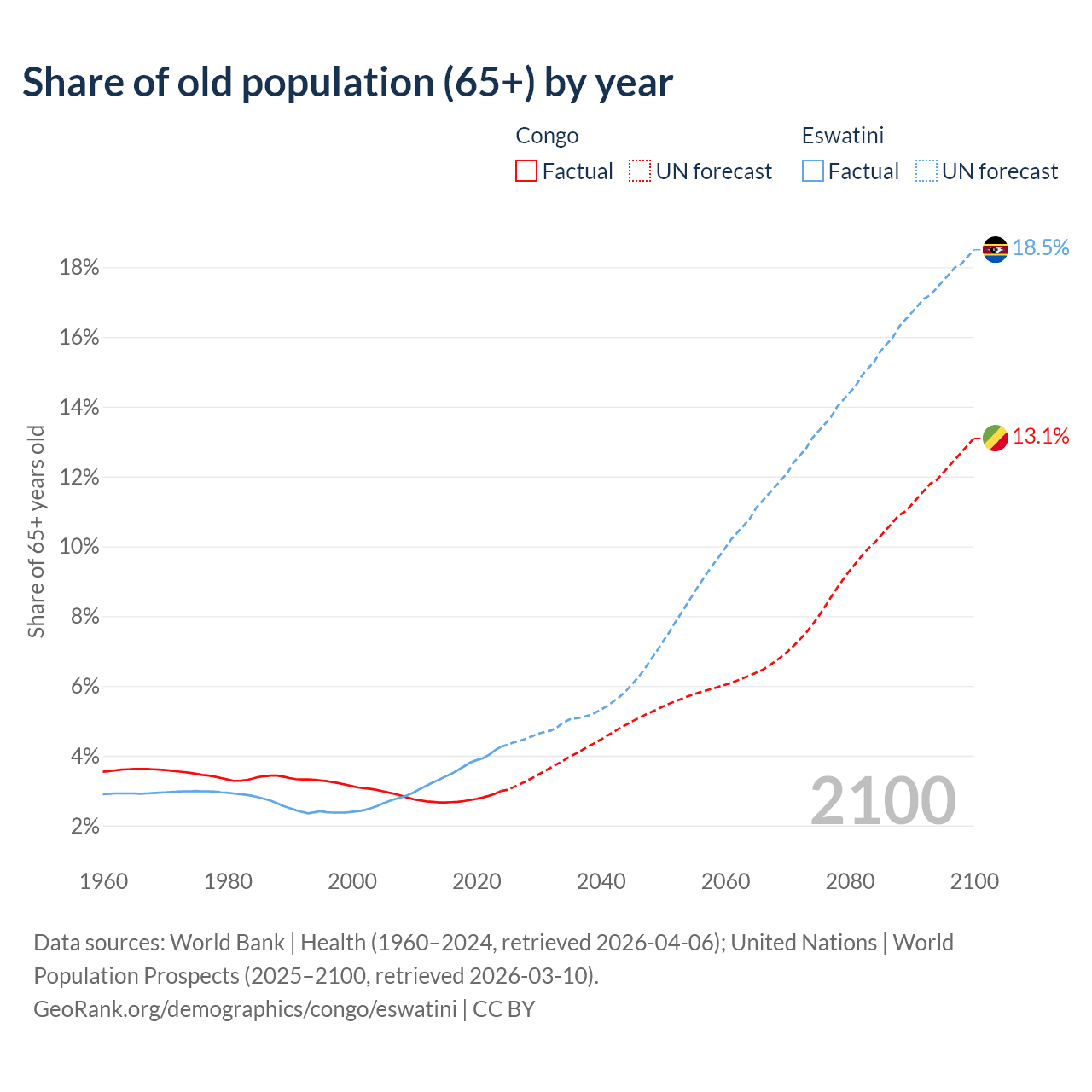 - The share of old-age demographic (65+) in the Congo is 2.99% vs 4.26% in Eswatini.