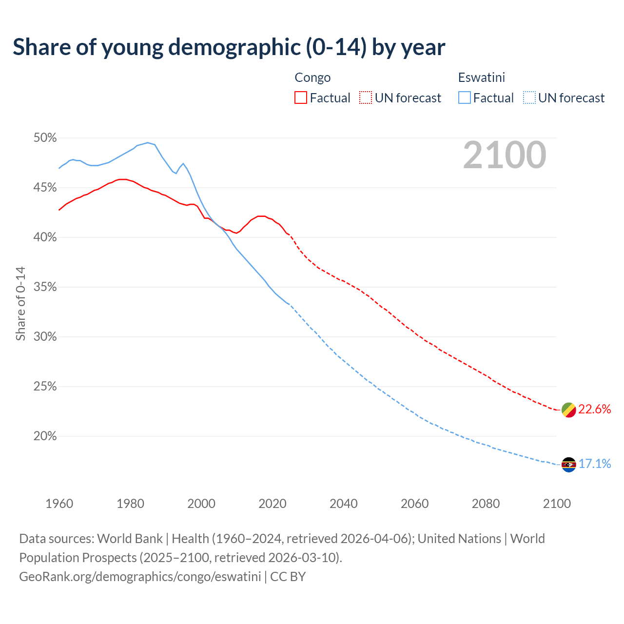 - The share of young demographic (0-15 years old) in the Congo is 40.4% vs 33.4% in Eswatini.