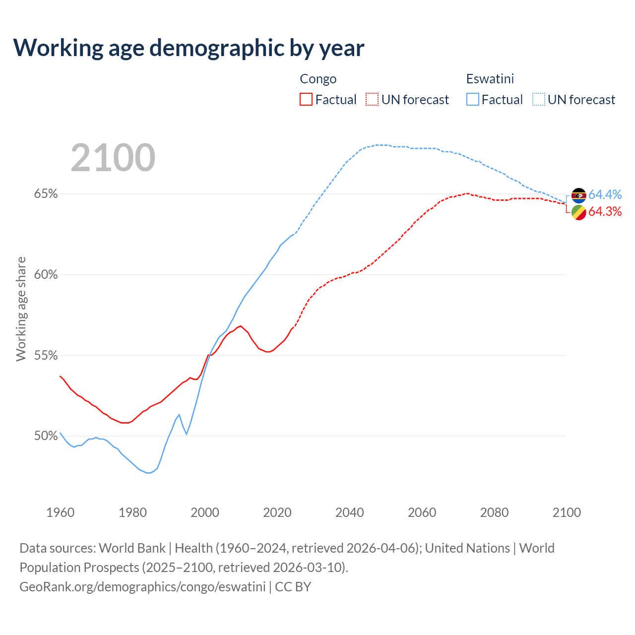 - The Congo has 3.78M working age adults (aged 15-64) vs 794K in Eswatini.