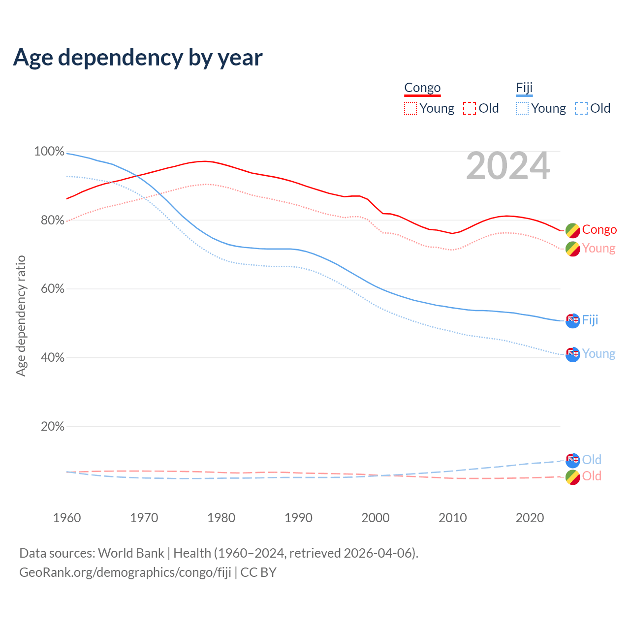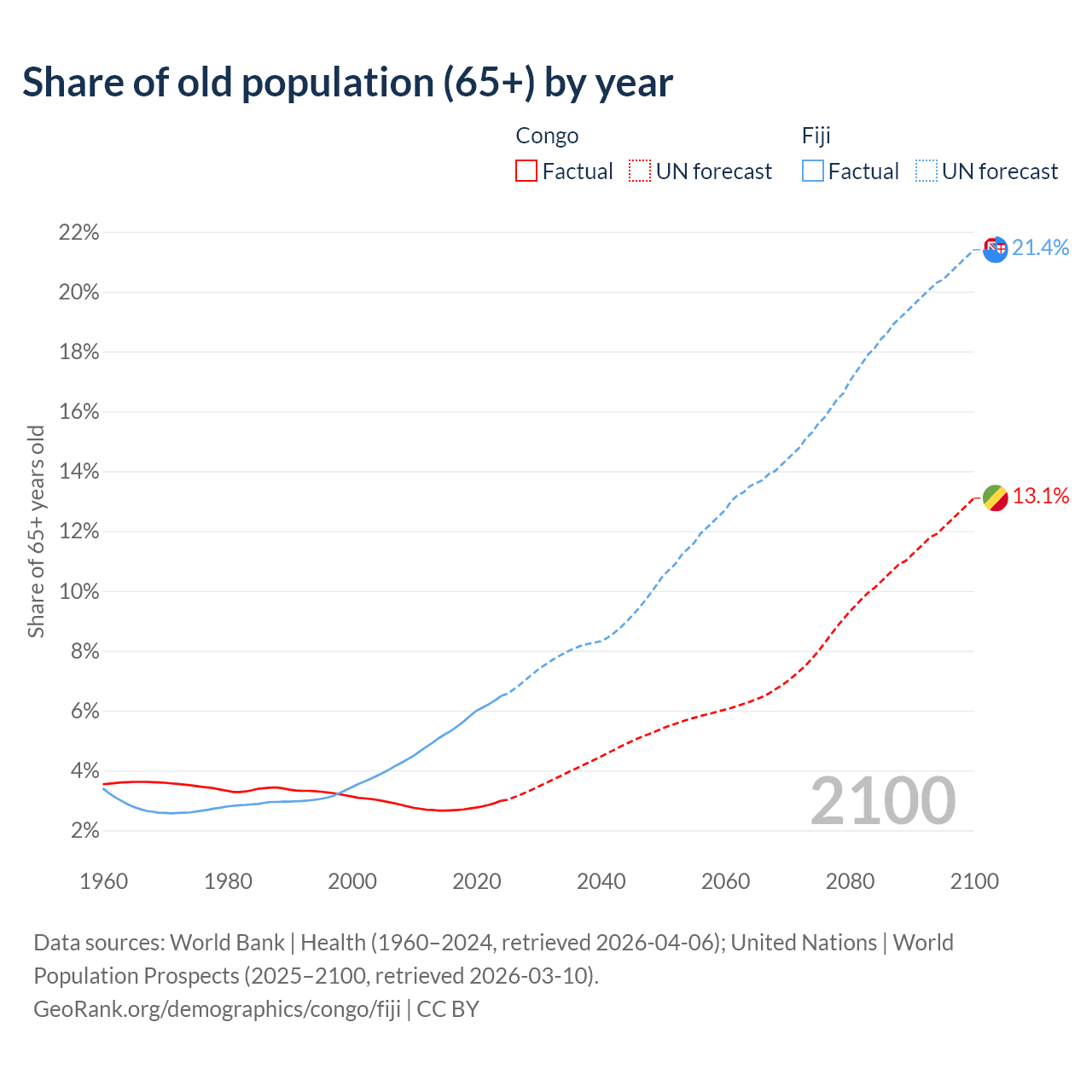 - The share of old-age demographic (65+) in the Congo is 2.99% vs 6.49% in Fiji.