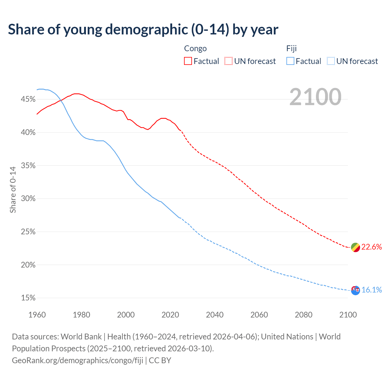 - The share of young demographic (0-15 years old) in the Congo is 40.4% vs 27.1% in Fiji.