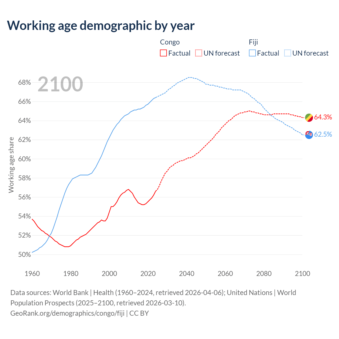 Median age Congo vs Fiji, 1960-2100
