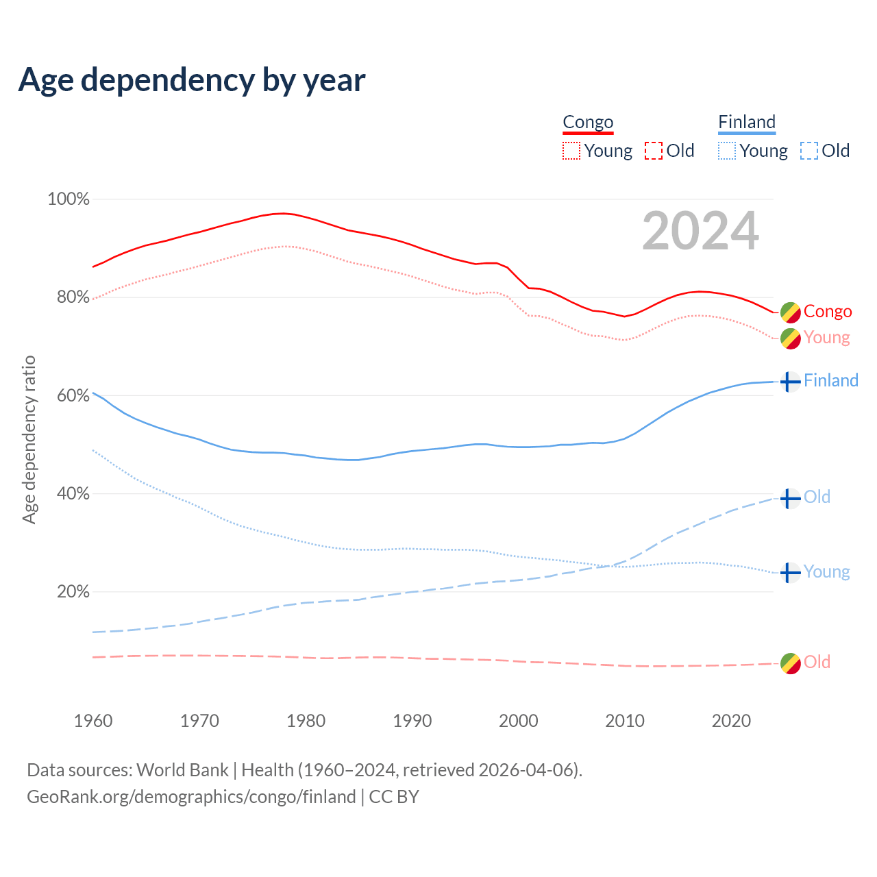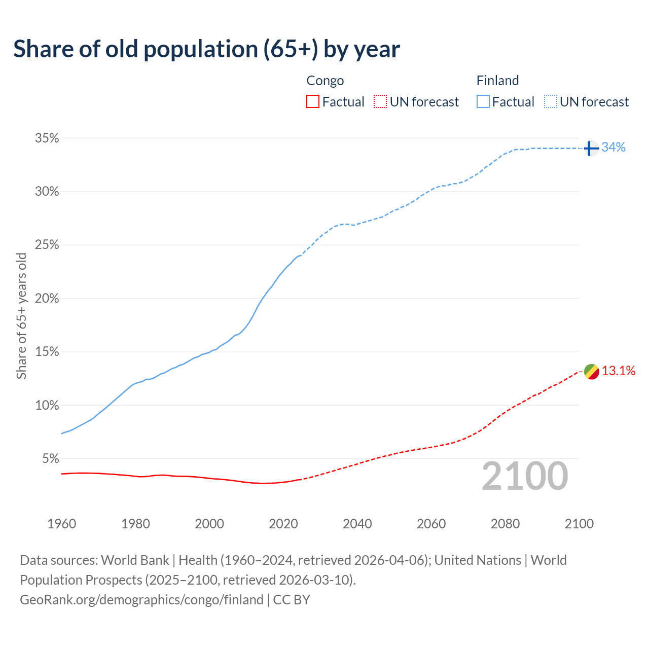 - The share of old-age demographic (65+) in the Congo is 2.99% vs 23.9% in Finland.