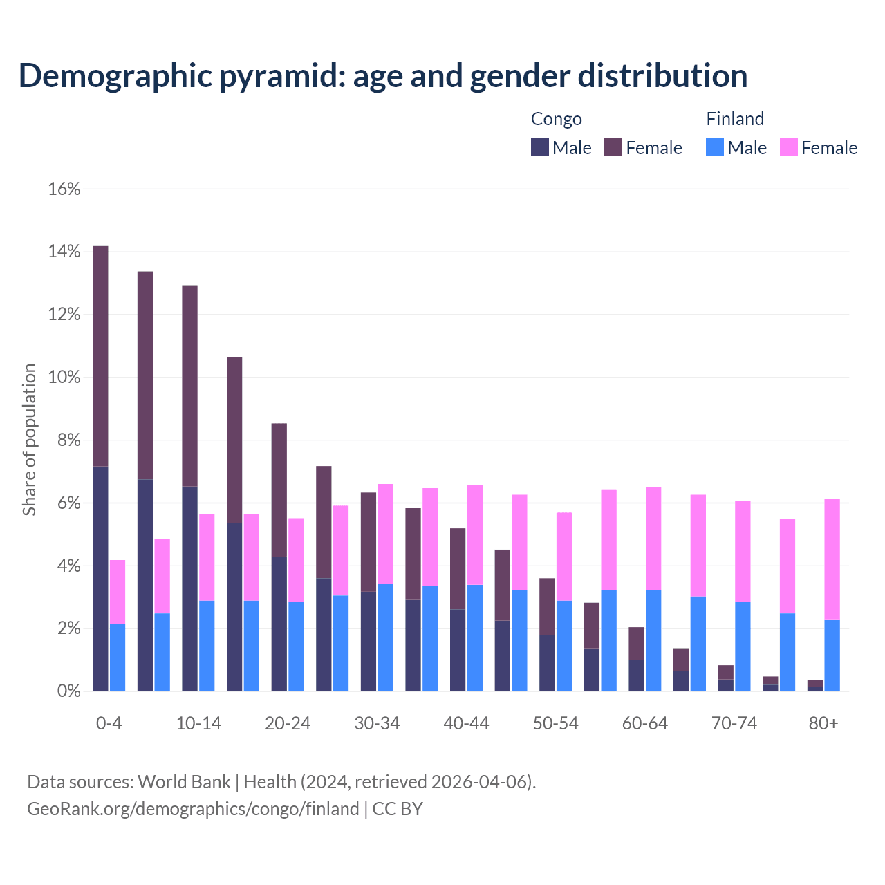 - The share of young demographic (0-15 years old) in the Congo is 40.4% vs 14.6% in Finland.