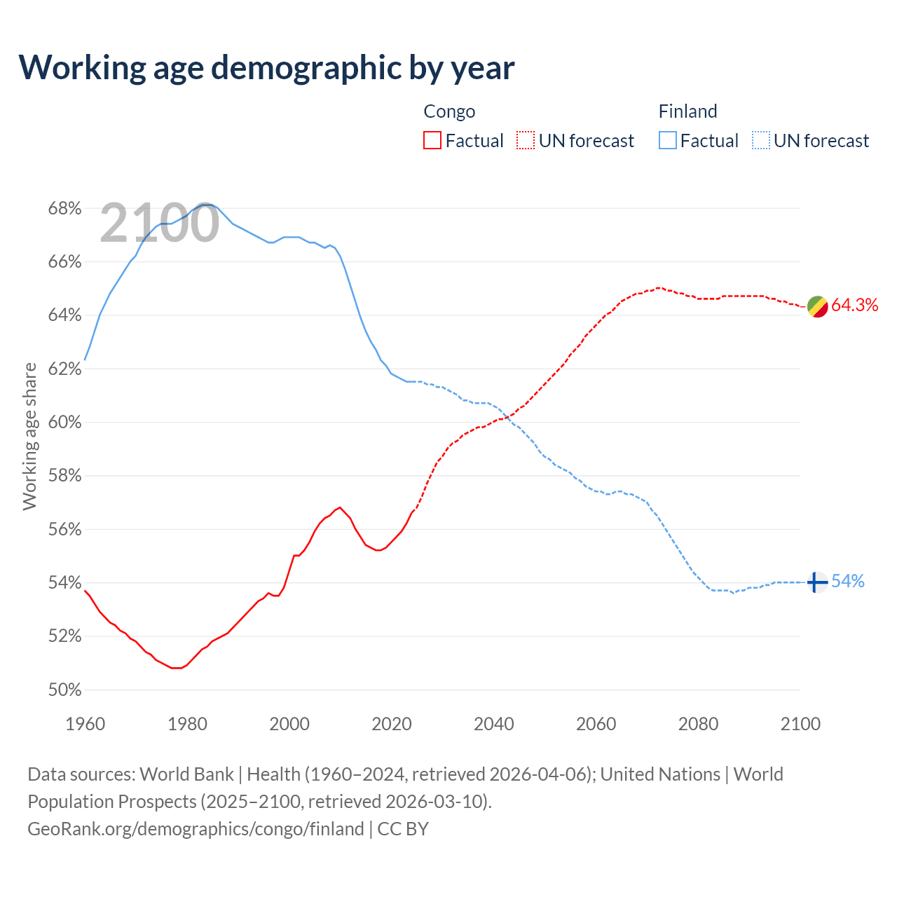 - The Congo has 3.78M working age adults (aged 15-64) vs 3.46M in Finland.