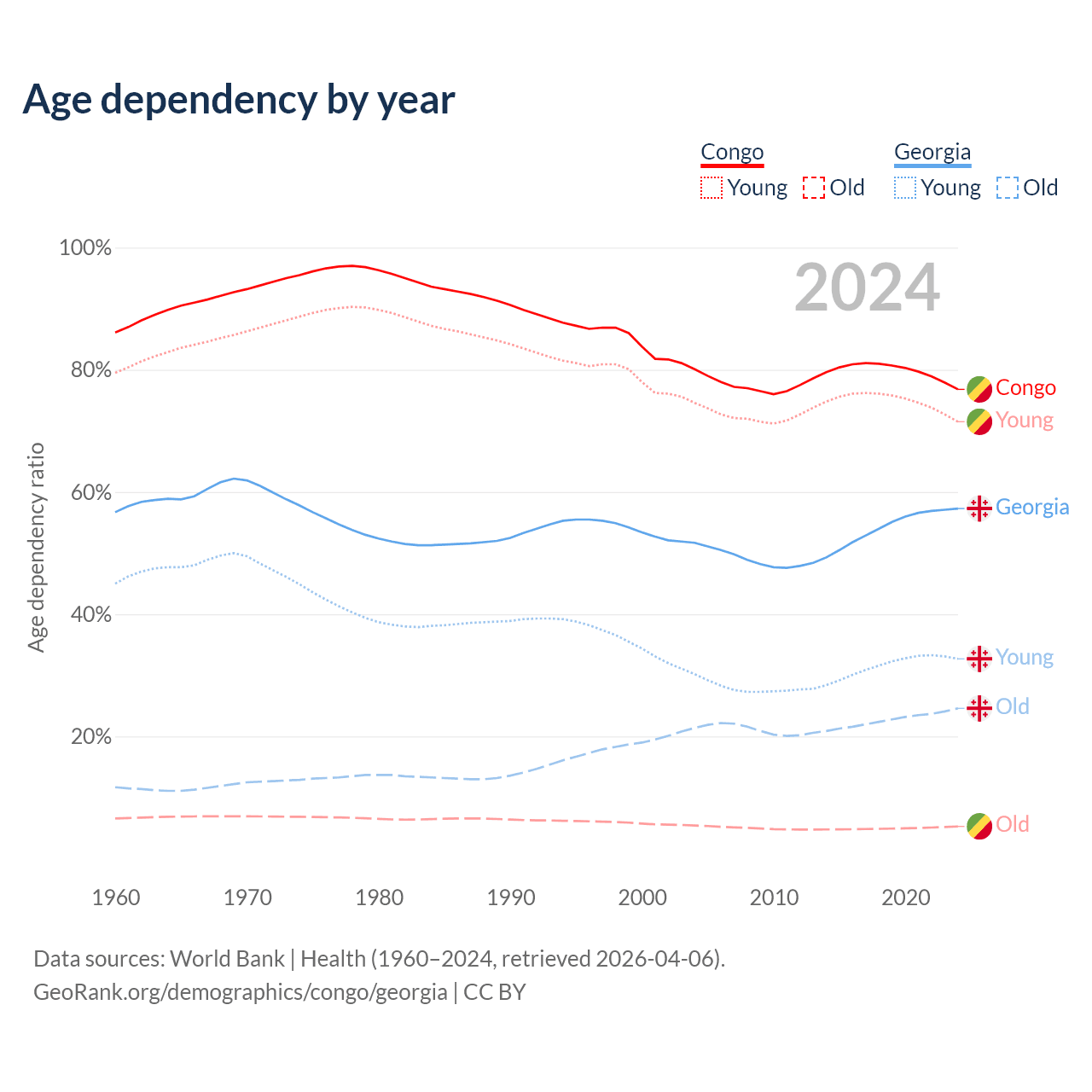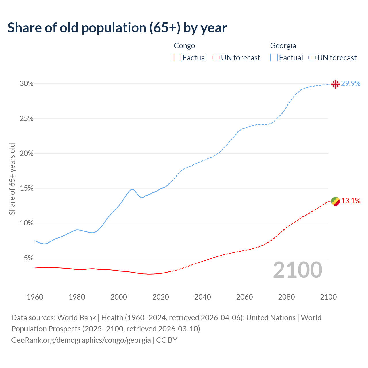 - The share of old-age demographic (65+) in the Congo is 2.99% vs 15.6% in Georgia.