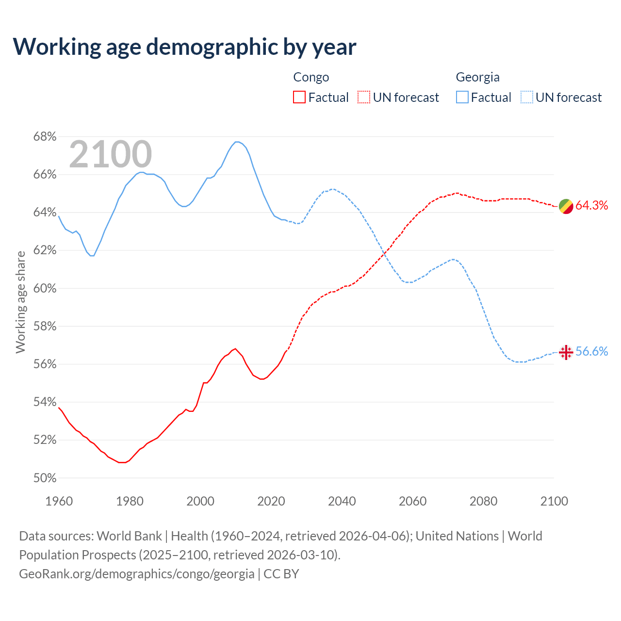 Median age Congo vs Georgia, 1960-2100