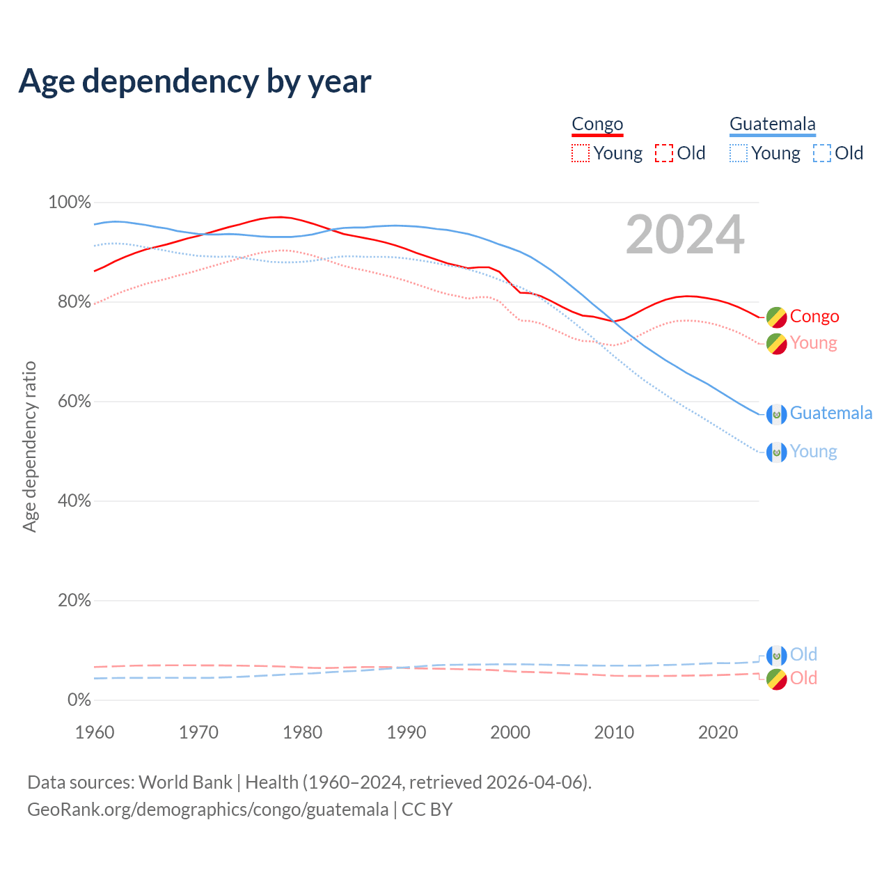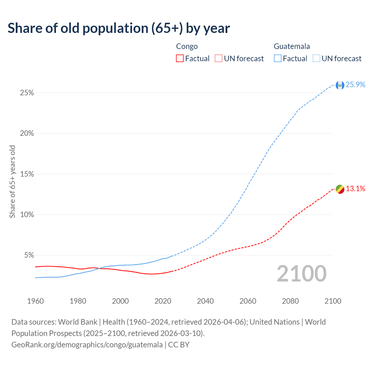 - The share of old-age demographic (65+) in the Congo is 2.99% vs 4.85% in Guatemala.